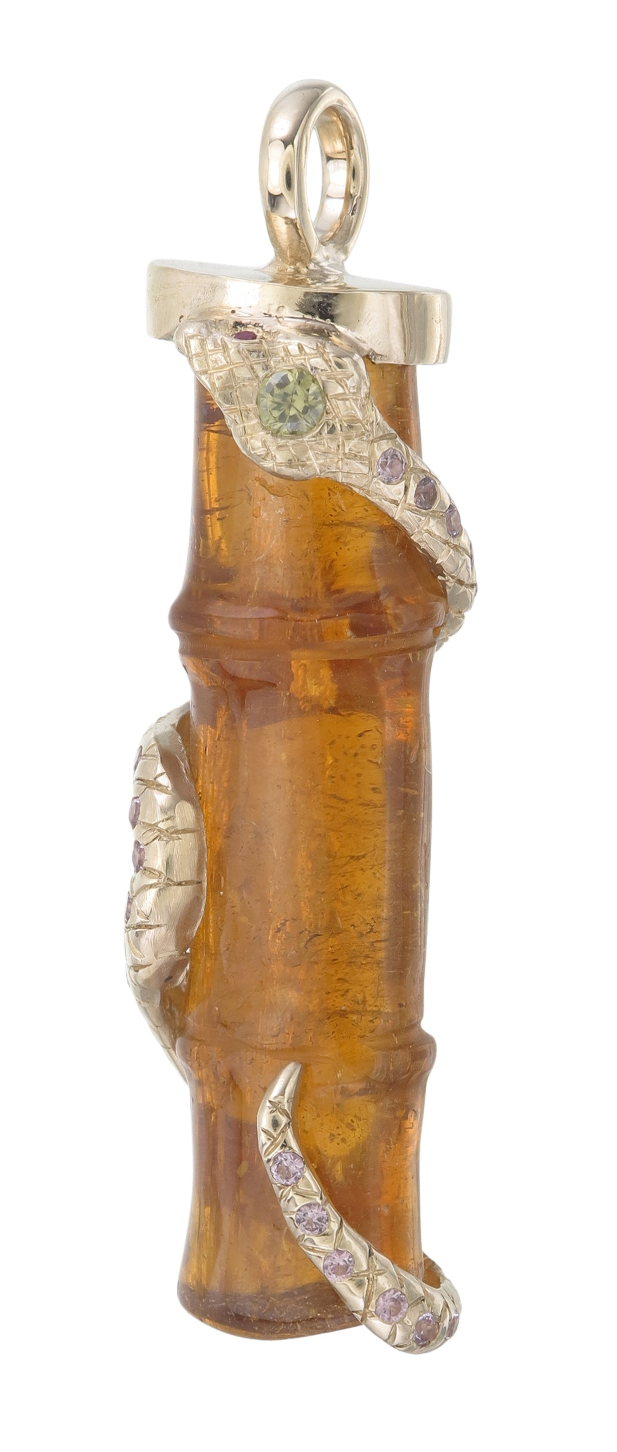 this beautiful pendant is made from Orange tourmaline, with purple spinel and a yellow sapphire in the head of the snake.