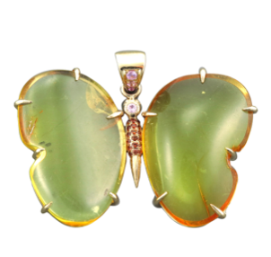 This exquisite specimen consists of wings of amber, a gold ruby body, and a pink sapphire head all set in 14-karat gold.