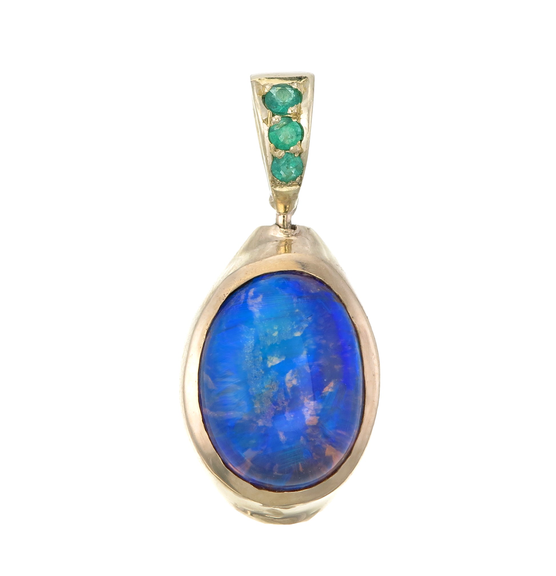 this cute little pendant measures 10mm wide and 20mm tall from top of bail... it has an exquisite bolder opal (with very little boulder matrix) and 3 beautiful emeralds on the bail, which spins around... set in 14k gold.