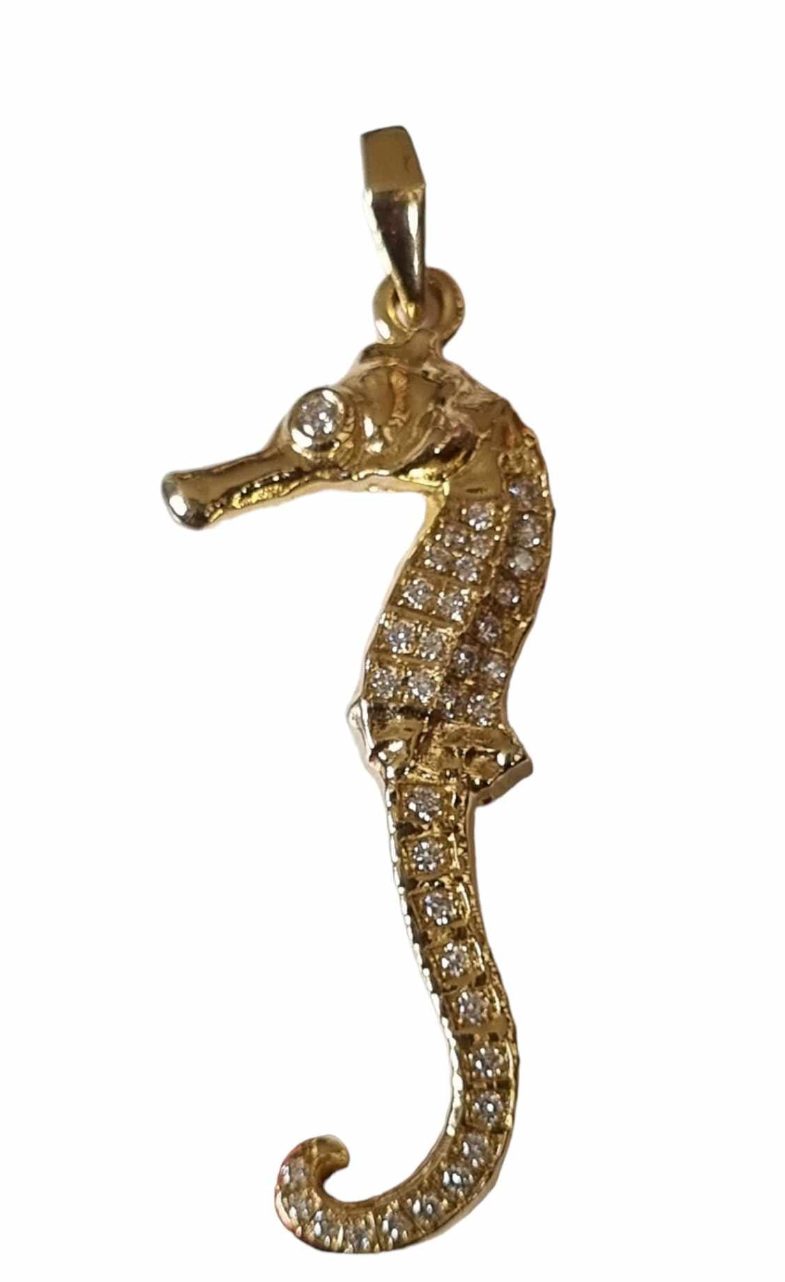 This beautiful 18-karat gold seahorse pendant features 36 little diamonds as unique and special as these small marine fish.