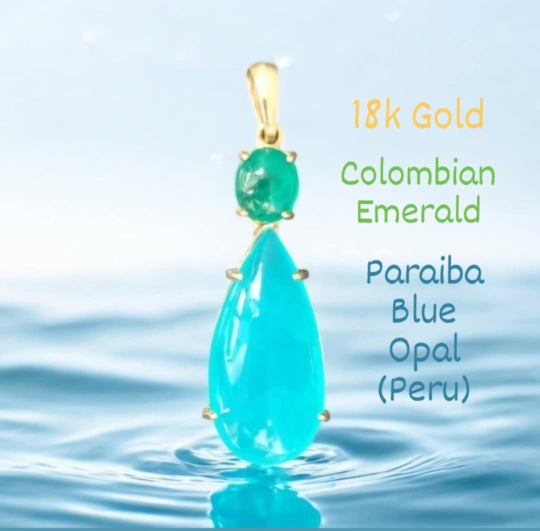 The beautiful little emerald (.98 ct) emerald comes from the rainforest deep in the Andes Mountains in Columbia... the blue opal (9.7 ct) ,, one of the nicest I have ever laid my eyes and then hands upon is from neighboring Peru and was cut in Milan, Italy by some really nice folks I met at a show in France I attend every year... I designed this so that the opal swivels a bit. it measures about 12mm wide by 35mm long...