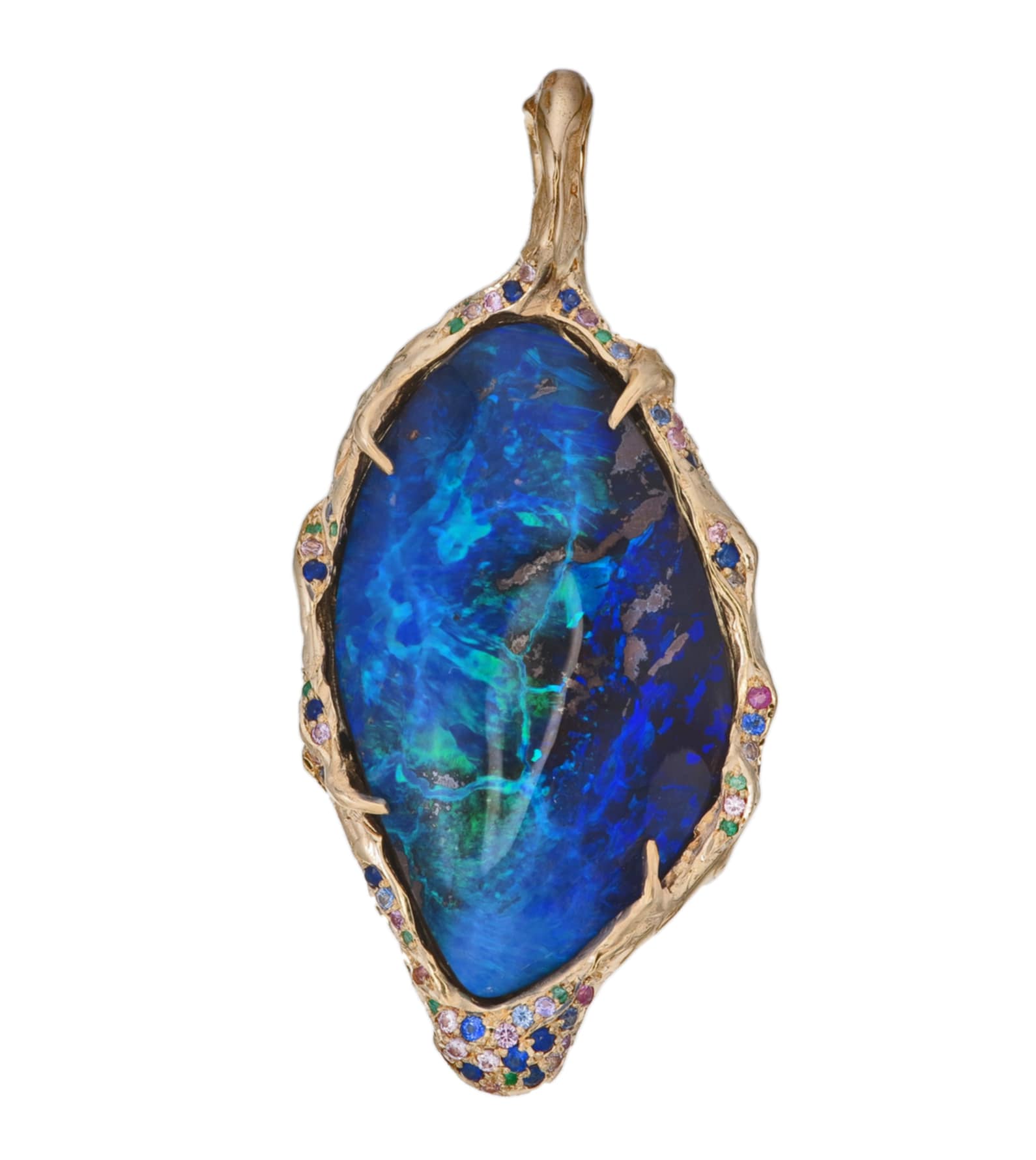 A lovely Boulder opal set in 18k gold with 61 tiny emeralds, rubies, and sapphires. The piece measures 45mm tall x 20mm wide.