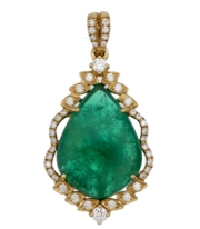 This impressive 18 karat gold pendant features a stunning deep green emerald and a lovely ornate array of diamonds.