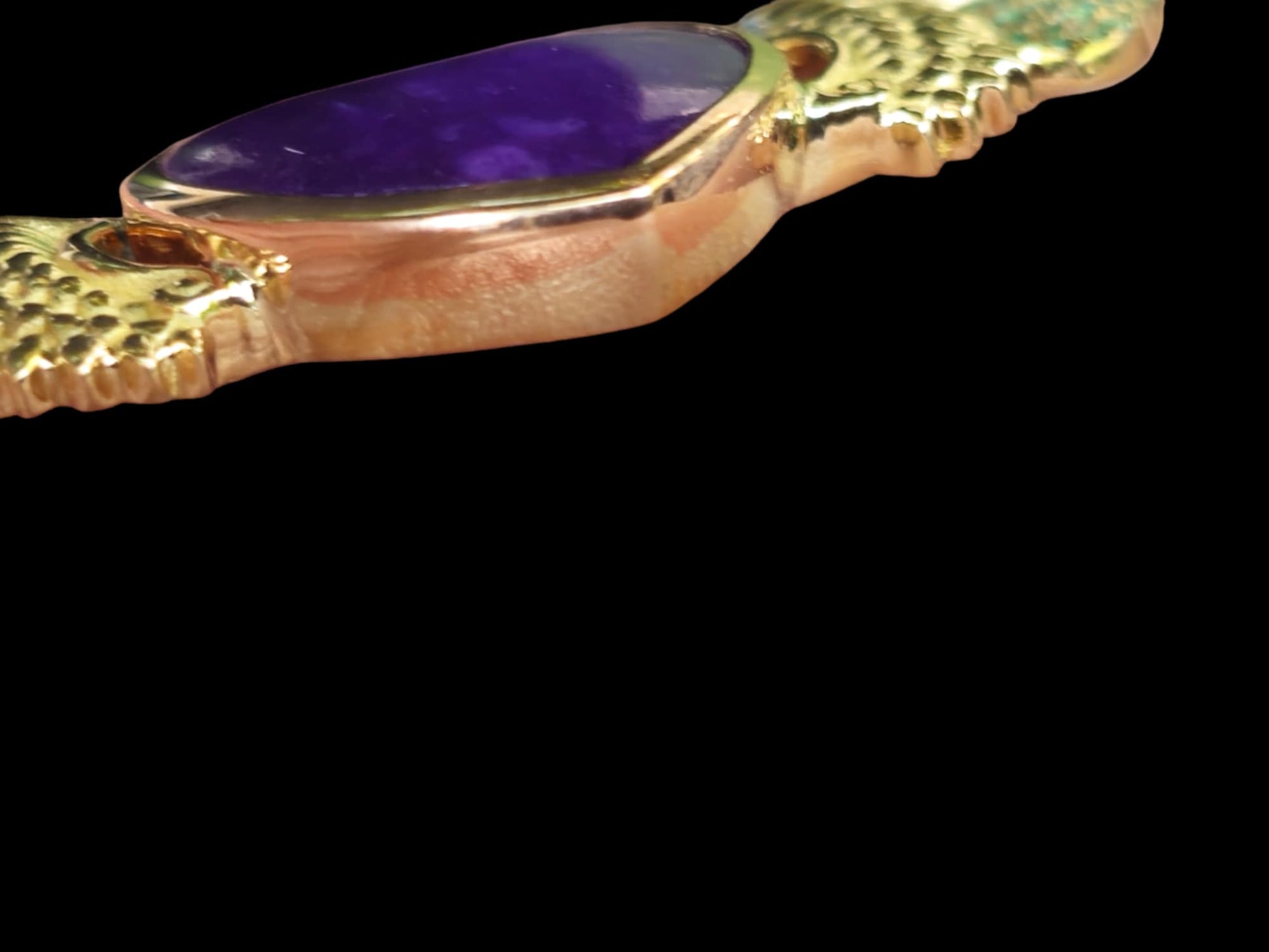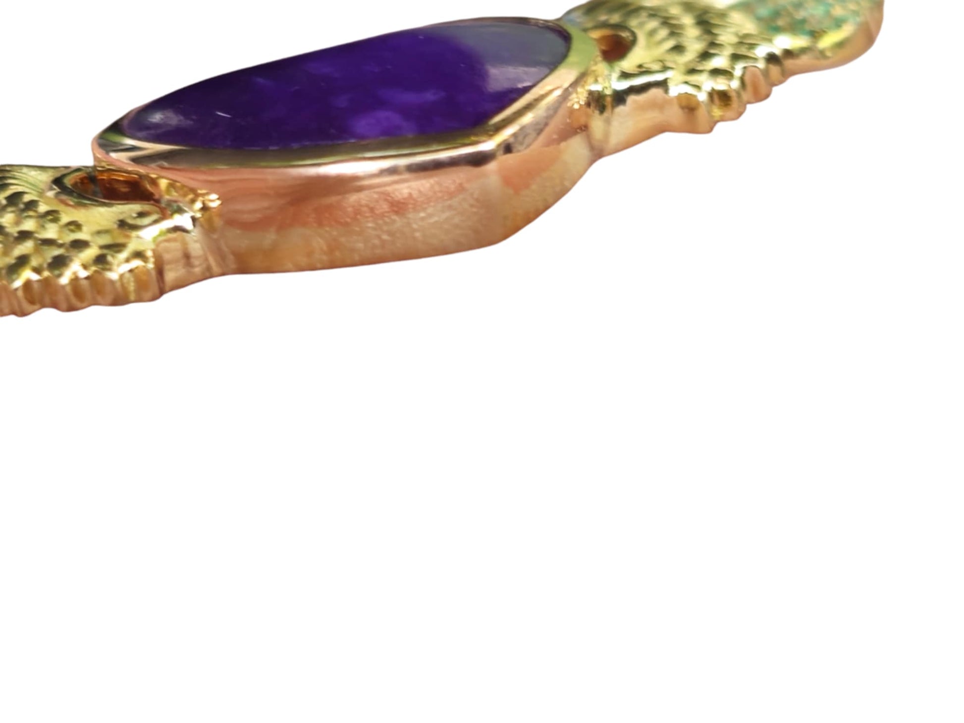 this beautiful pendant is attached to an 18k gold Italian made chain, the whole necklace measures 17.5 inches and has 56 tiny emeralds in the wings...