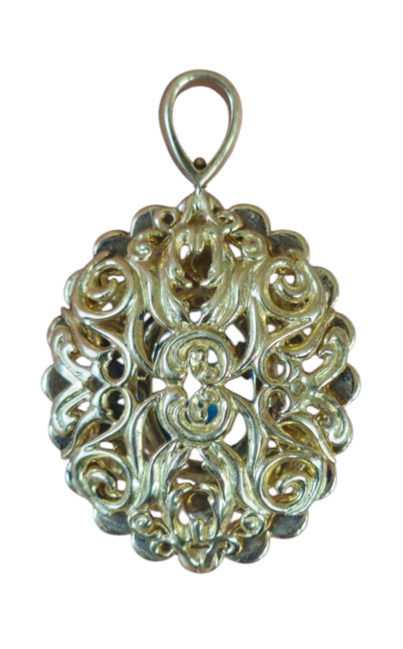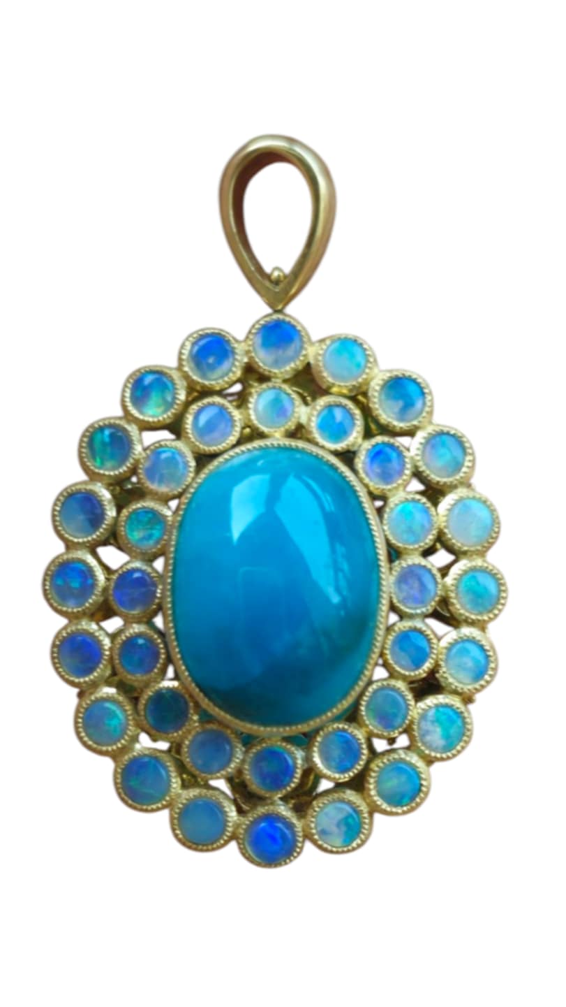 Wow! That's all that can be said about this exquisite piece of jewelry. Super blue hemimorphite is said to heal emotions and enhance communication. This stunning gem is surrounded by Australian opals set in 18 karat gold. It also spins around to show the exquisite goldwork on the back.