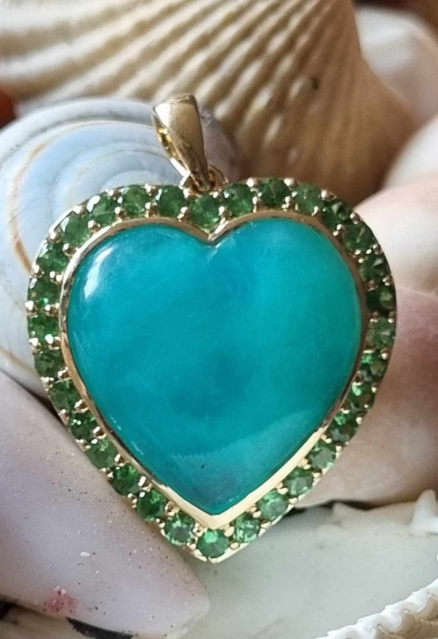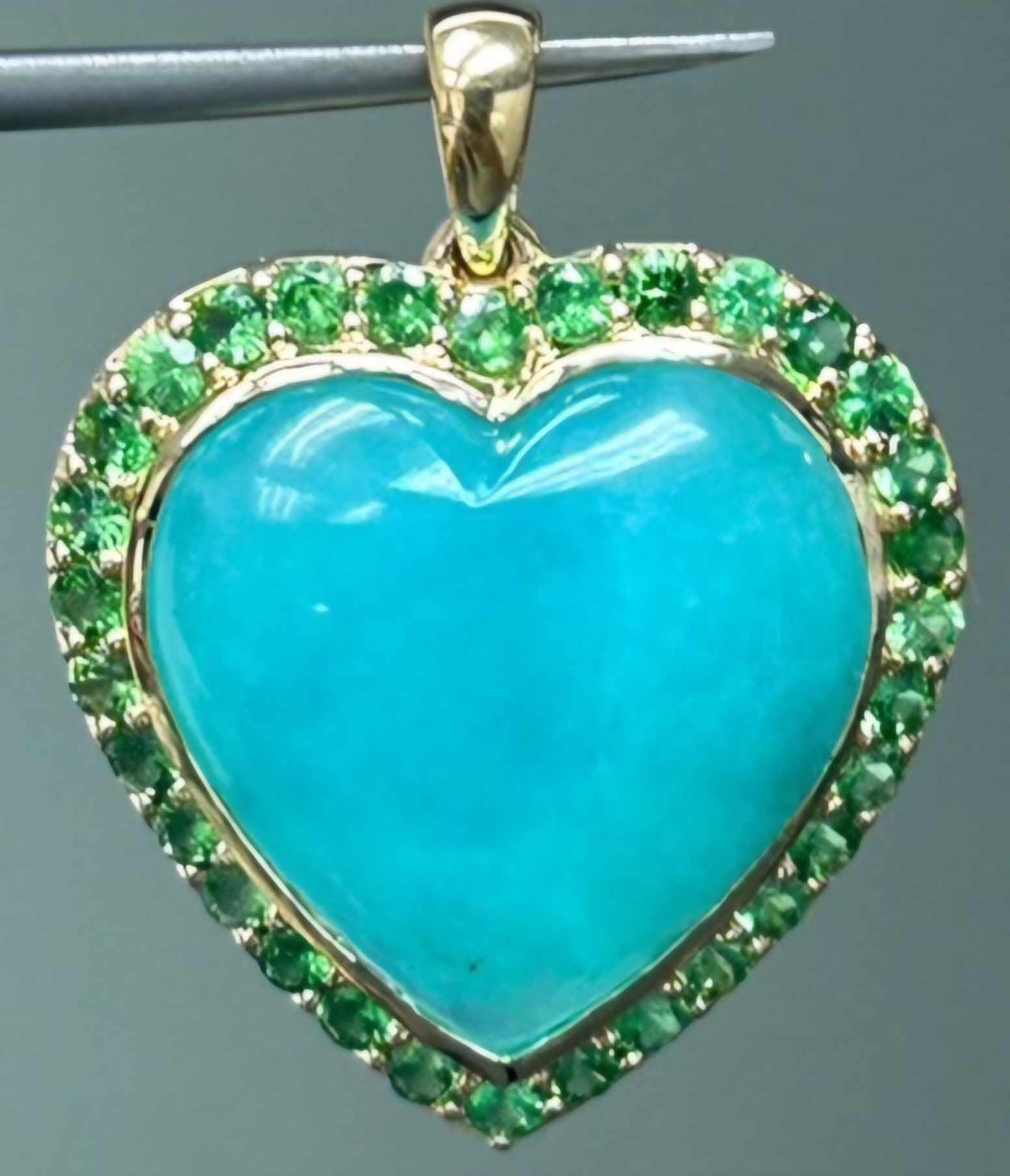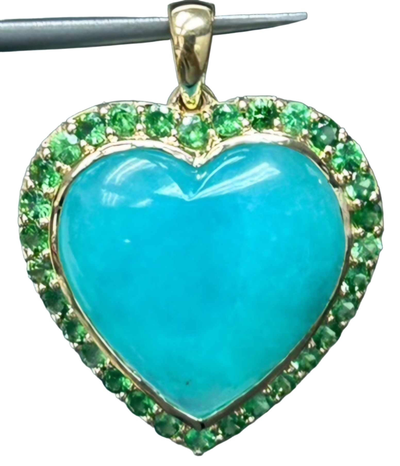 18k Gold Peruvian Blue Opal and Tsavorite Heart Pendant
