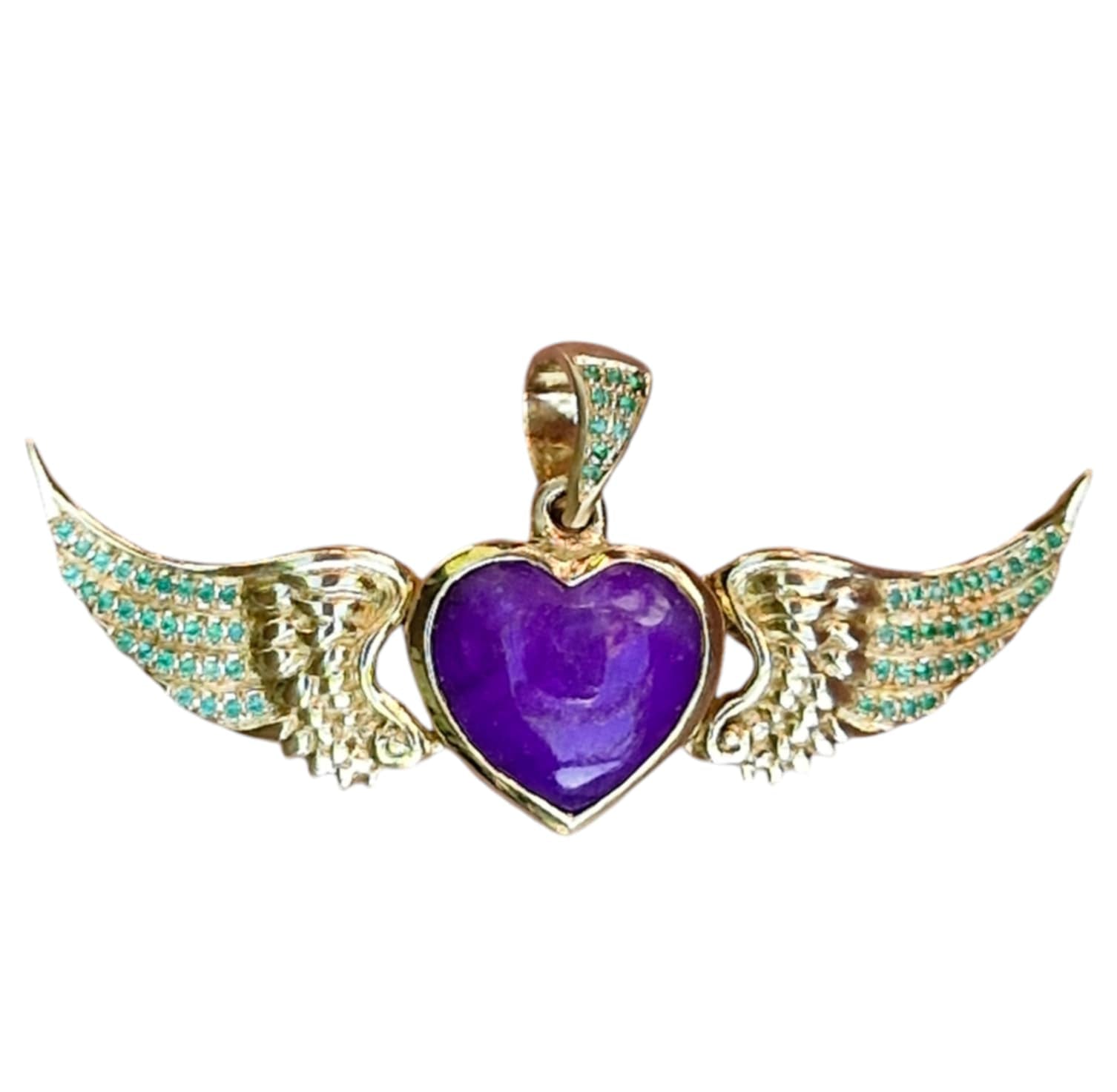 18k Gold Heart and Wings w/ Sugilite & Emeralds Pendant
