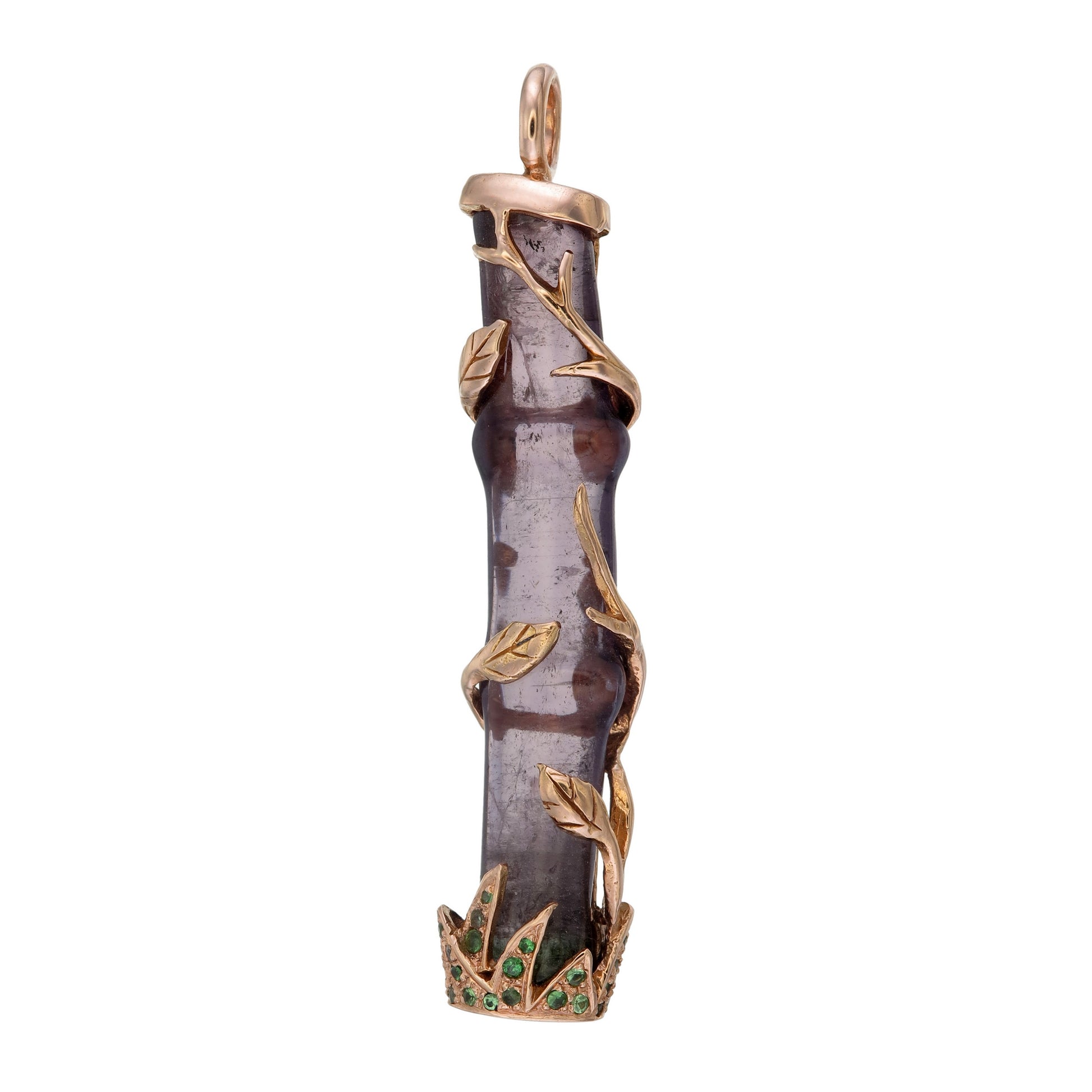 Very beautiful purple tourmaline (from an old collection) bamboo carving set in 18k pink gold and sprinkle with green tsavorites. measures 10mm x 50mm