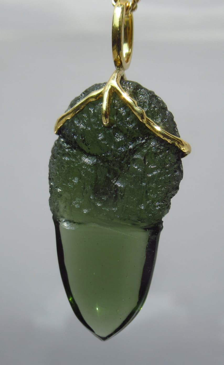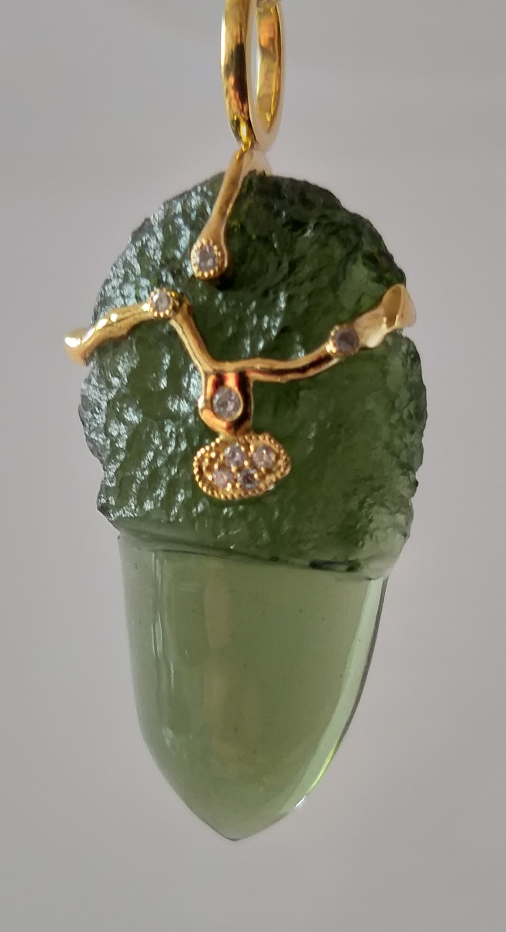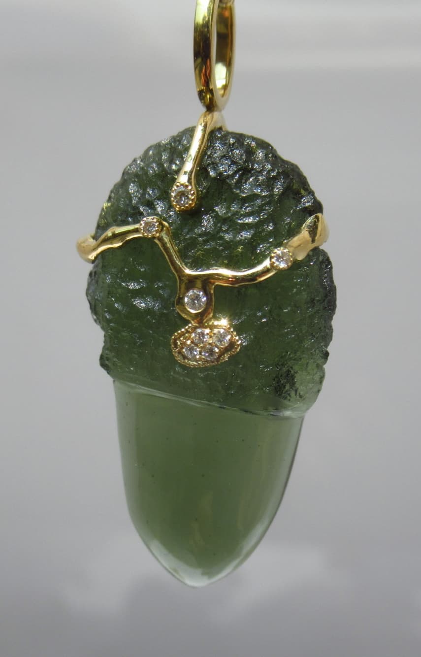 some might say this looks to be the shape of an acorn, we prefer to think of it as an Alligator tooth.. decorated with luscious 22k yellow gold and a few diamonds to add some sparkle, we drilled a tiny hole through the unpolished part to keep in place.. the piece measures 5/8" across x 1 1/4" long, (17mm x 30mm) . This is a fun piece...