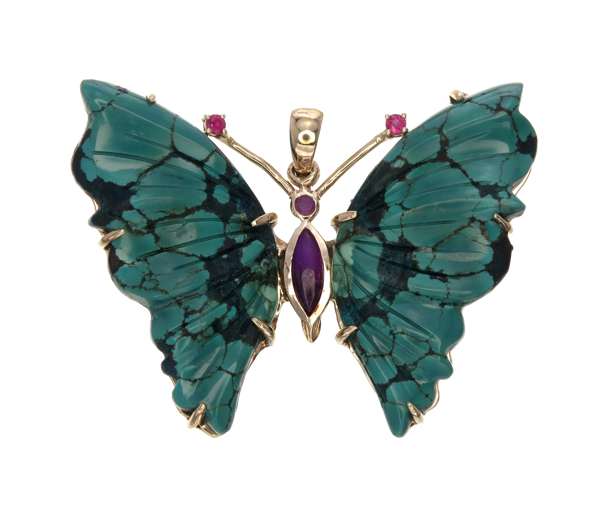 9k gold Butterfly w Turquoise, sugilite, and ruby
