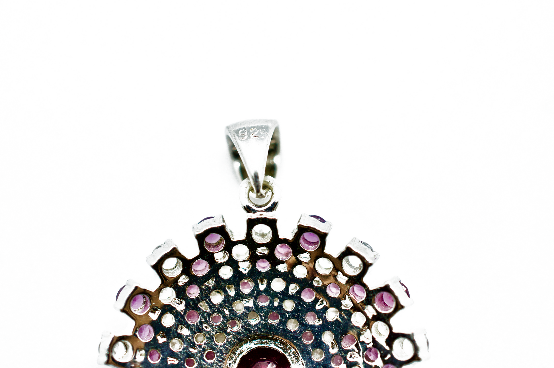 108 stones surround a deep purple amethyst. This pendant measures less than 1". The exquisite arrangement and colors bring us peace.