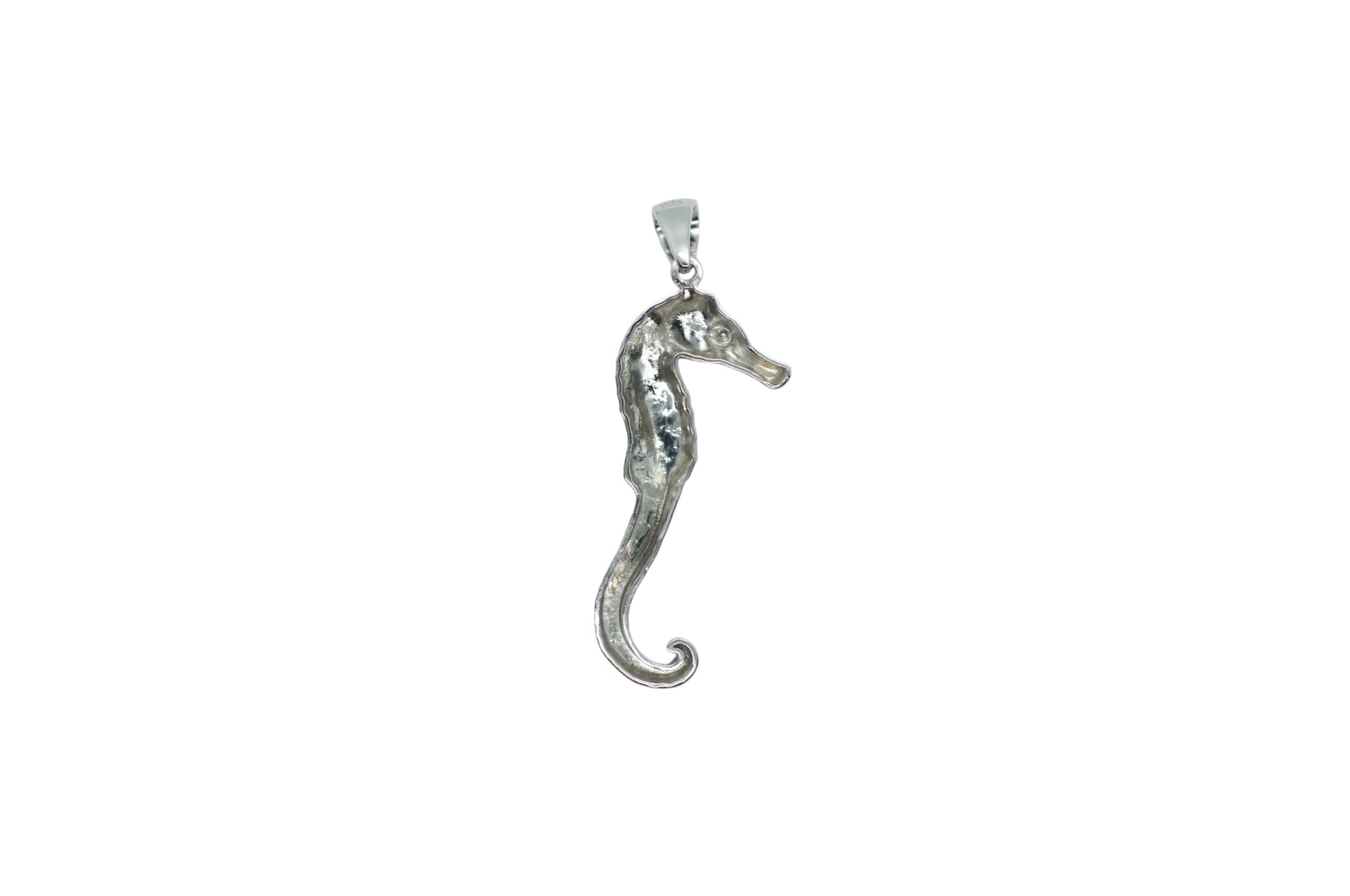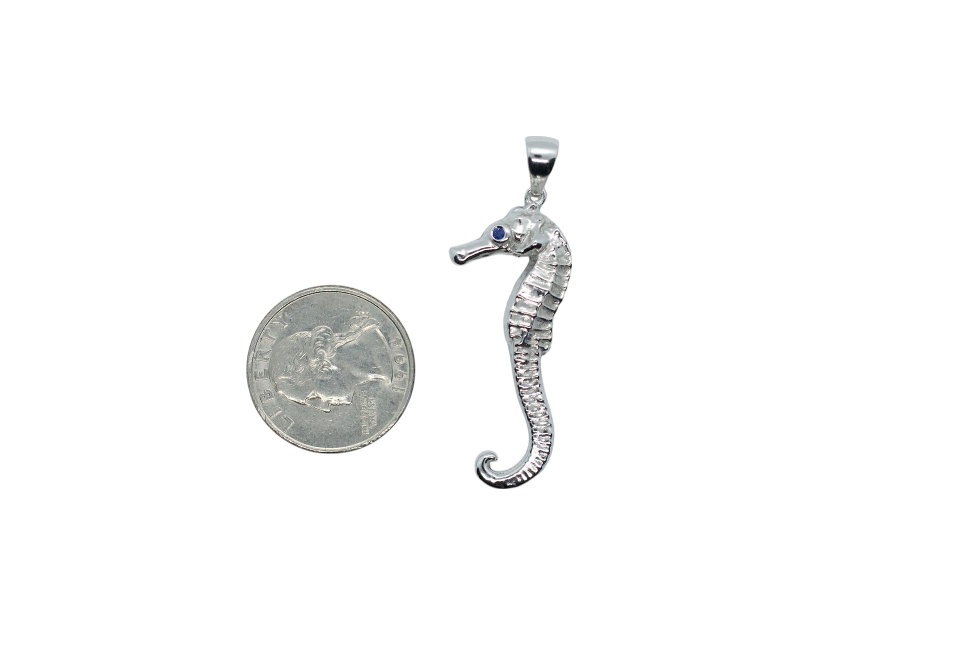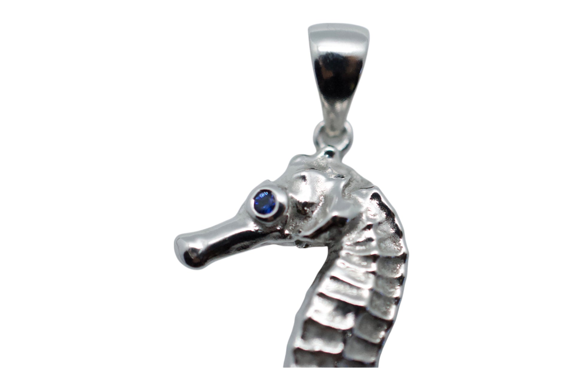 Our sweet, sterling silver seahorse necklace features a blue sapphire eye. The seahorse symbolizes across cultures: