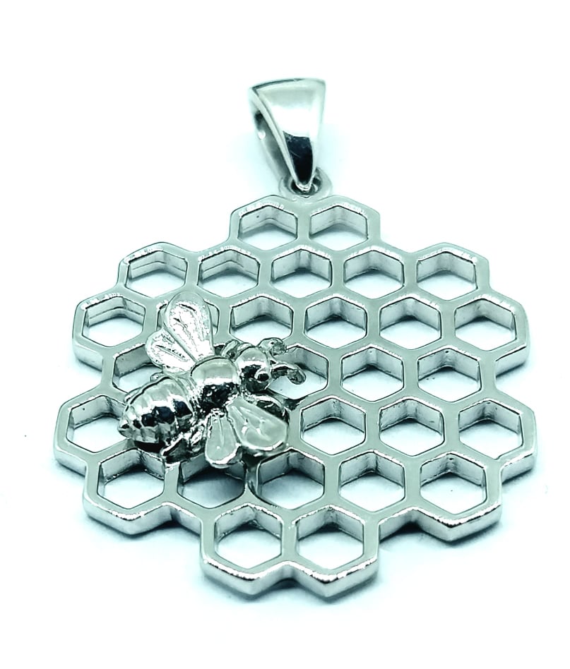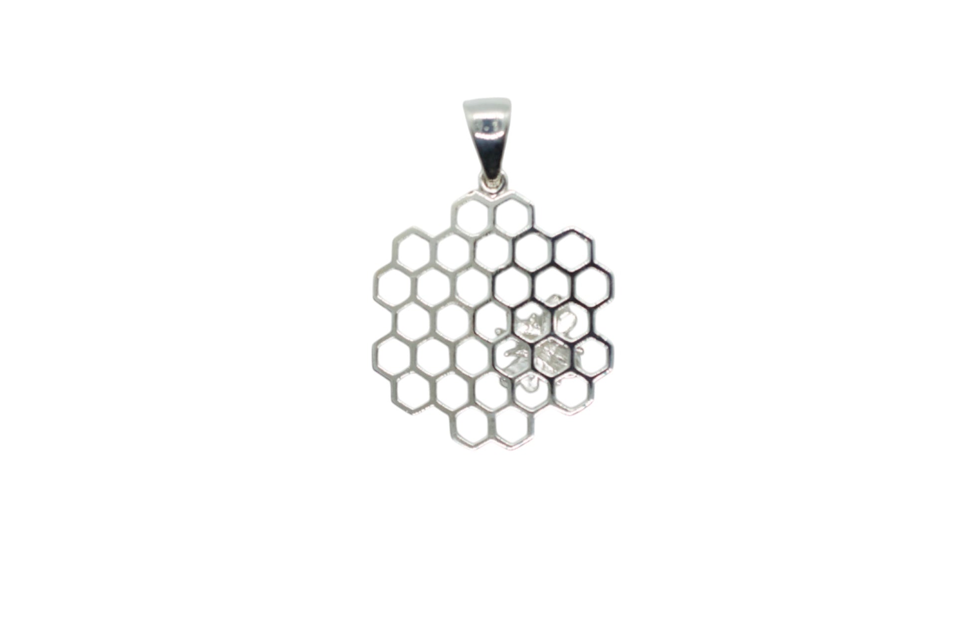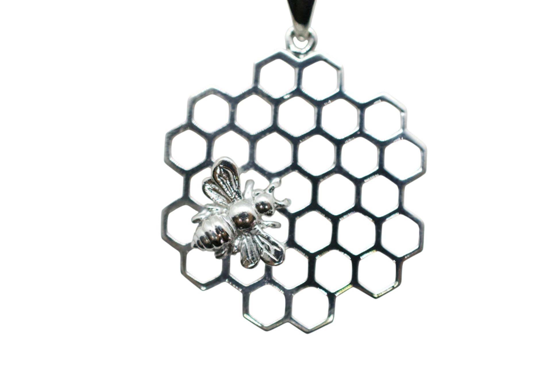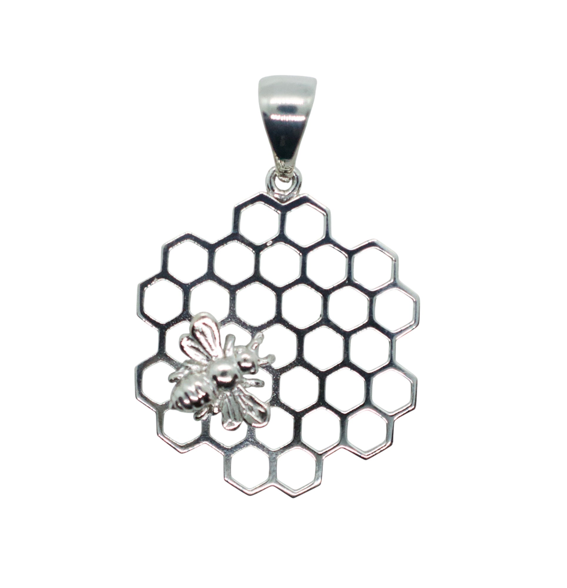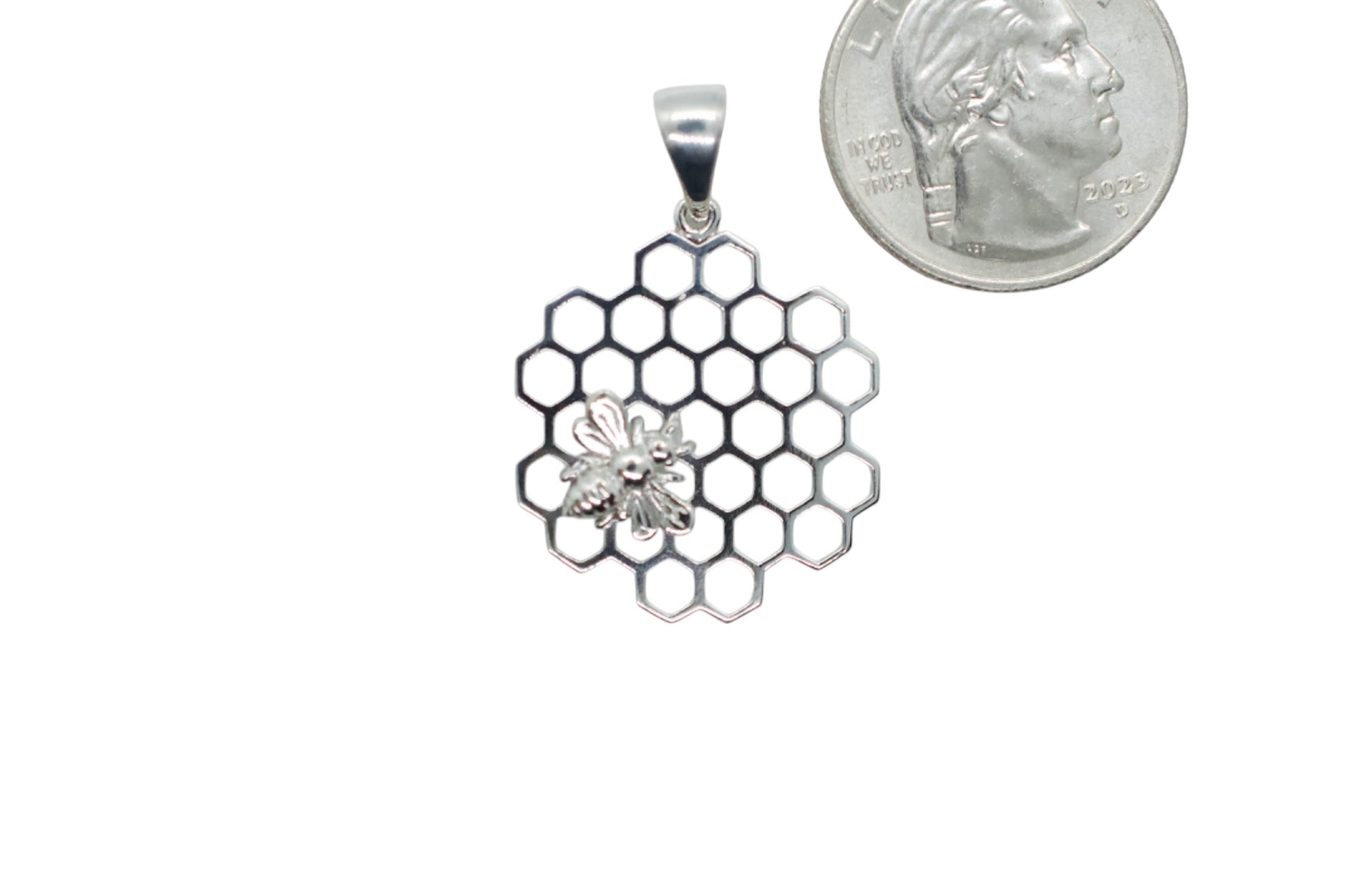 The Bee Sweet Silver Honeycomb and Bee Pendant features a sterling silver bee on top of a honeycomb. Without the bail, the honeycomb measures 1 inch in diameter. The little silver bee measures a little under 0.5 inches. We also offer this pendant with a gold bee atop a silver honeycomb.