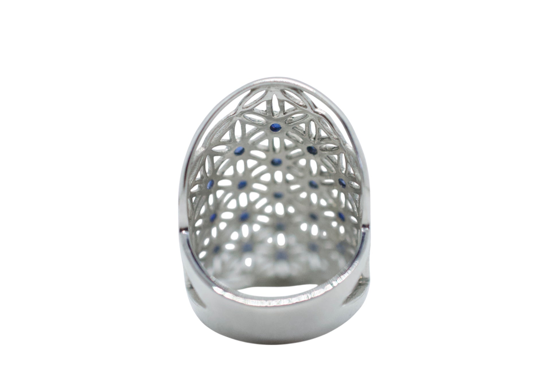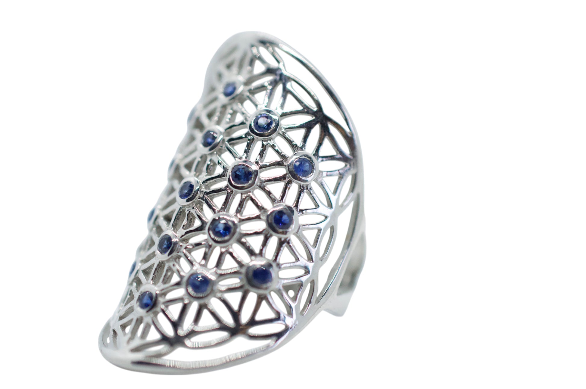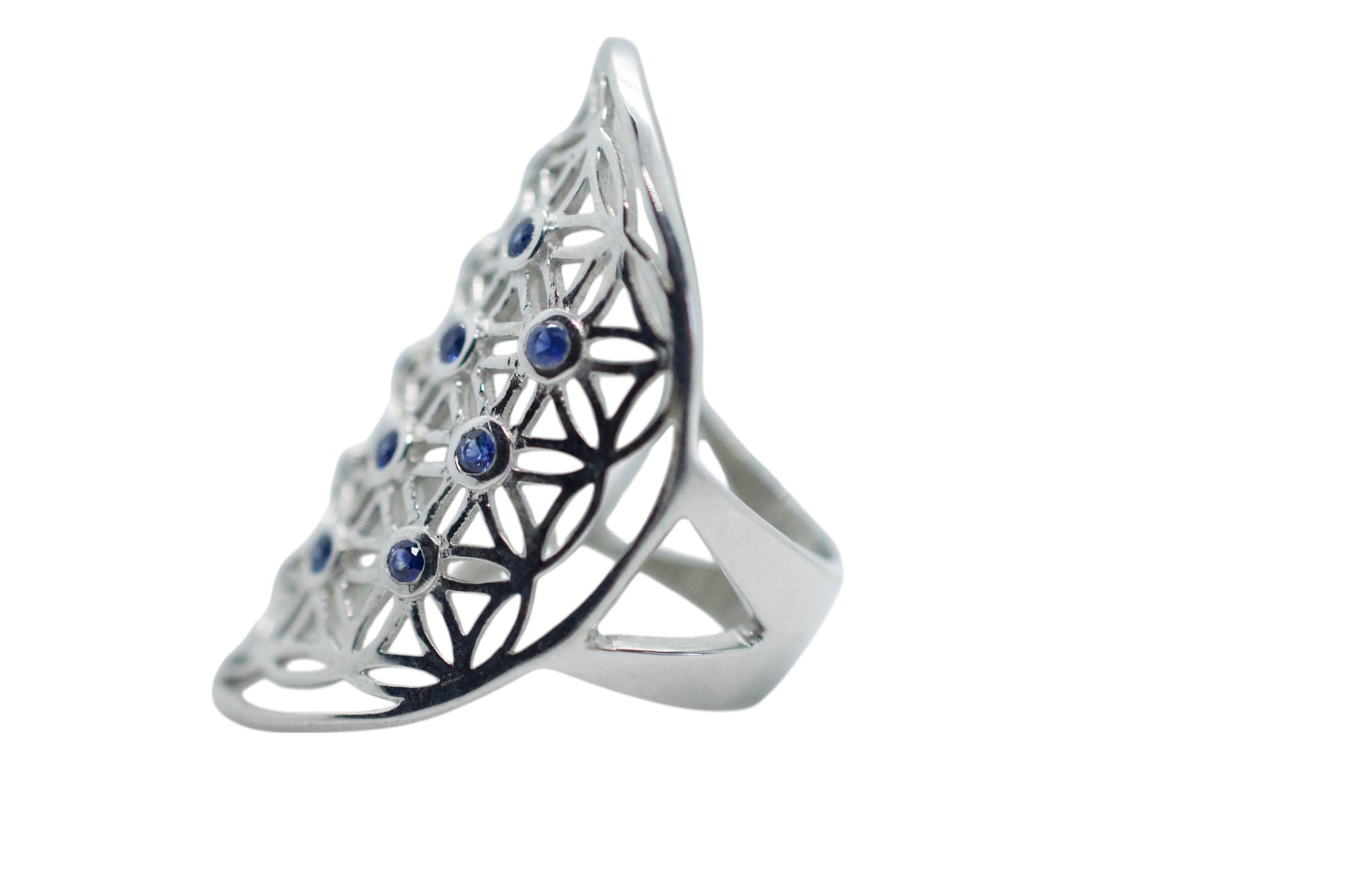 This beautiful flower of life ring features blue sapphires. The ring is a size US 8 and the sacred geometry symbol is 1.25" in height.