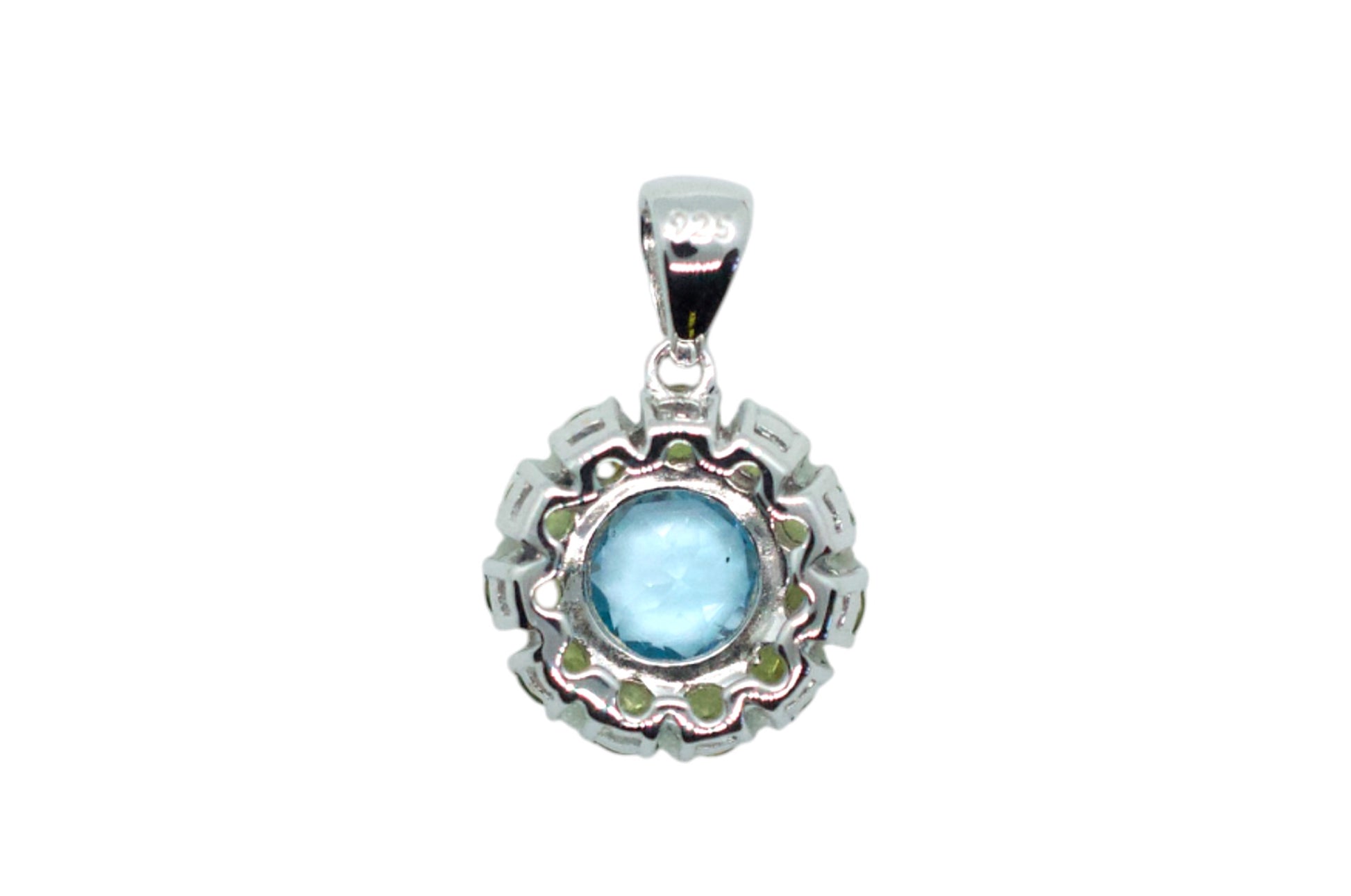 This sweet little mandala features a beautiful light blue topaz surrounded by green peridot gemstones set in sterling silver. It measures 1.5 cm in diameter.
