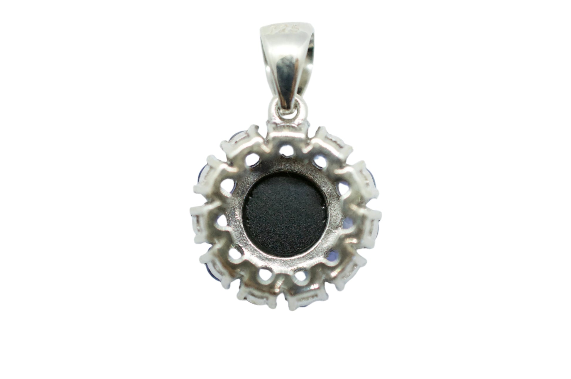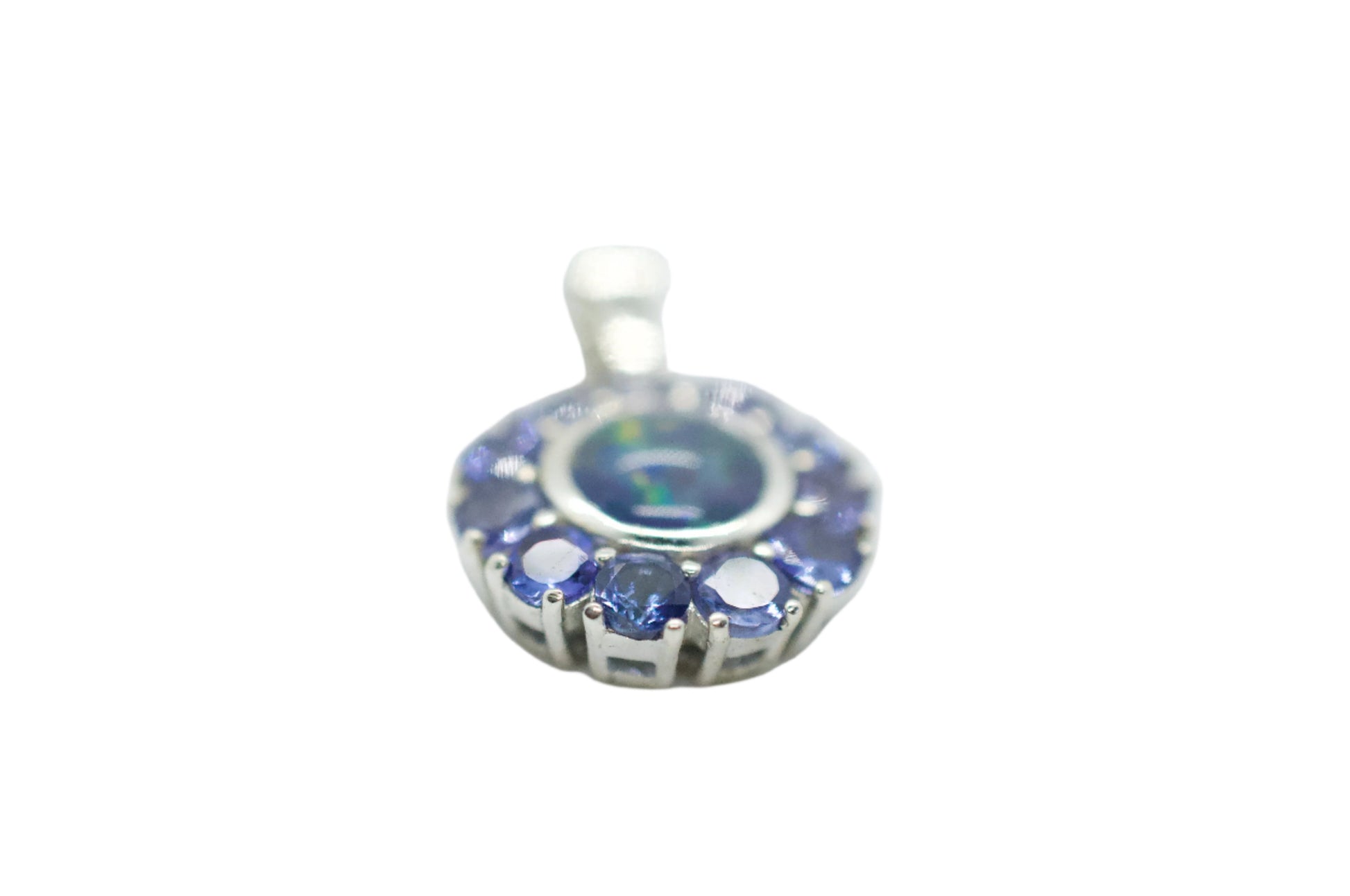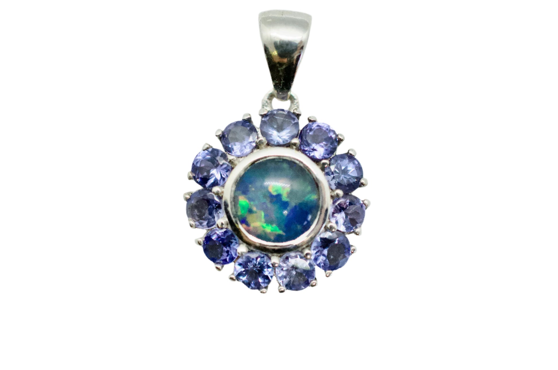 This sweet little mandala features a colorful opal triplet surrounded by blue tanzanite gemstones set in sterling silver. It measures 1.5 cm in diameter.