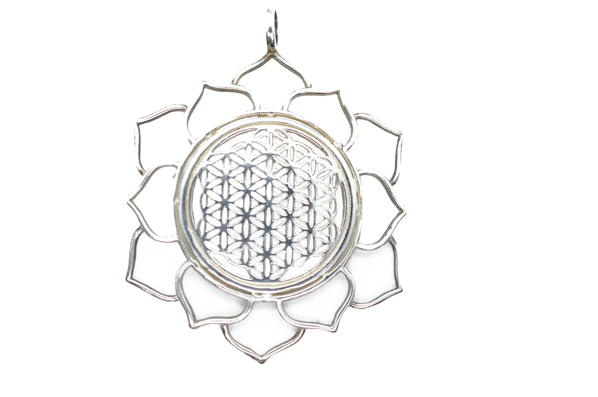 This beautiful pendant features an intricate flower of life set in lotus petals. The piece has a little tarnish, which is reflected in the price. Last one!