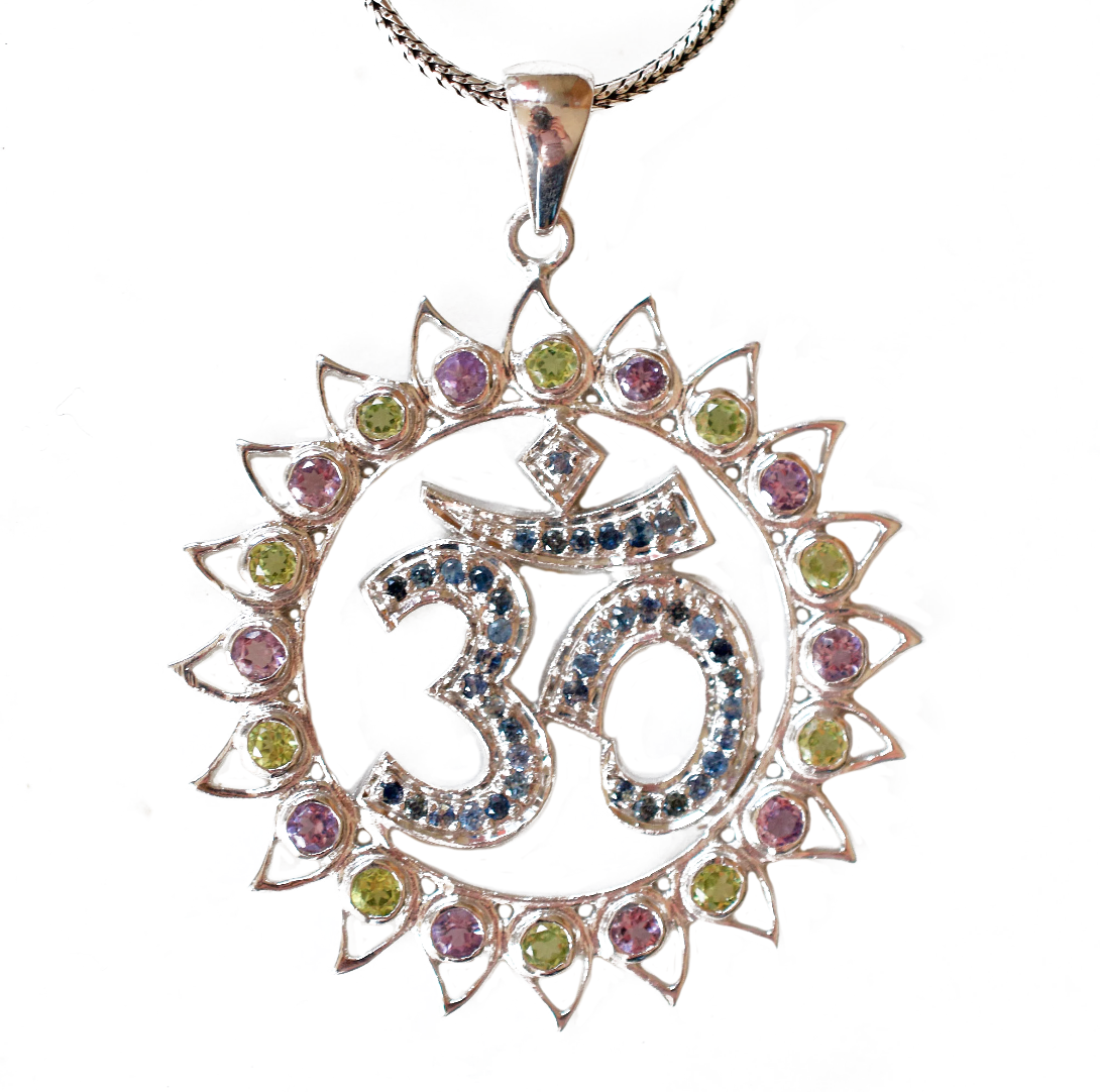 Om Shanti Lotus Gemmed Sterling Silver Pendant Peridot, Amethyst, Sapphire