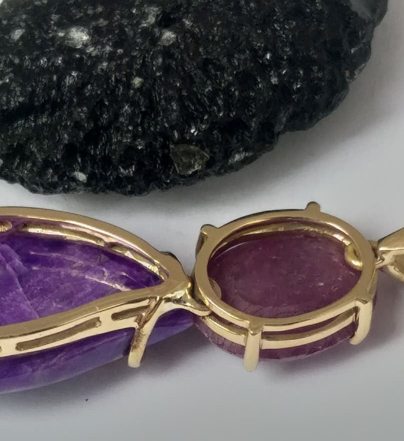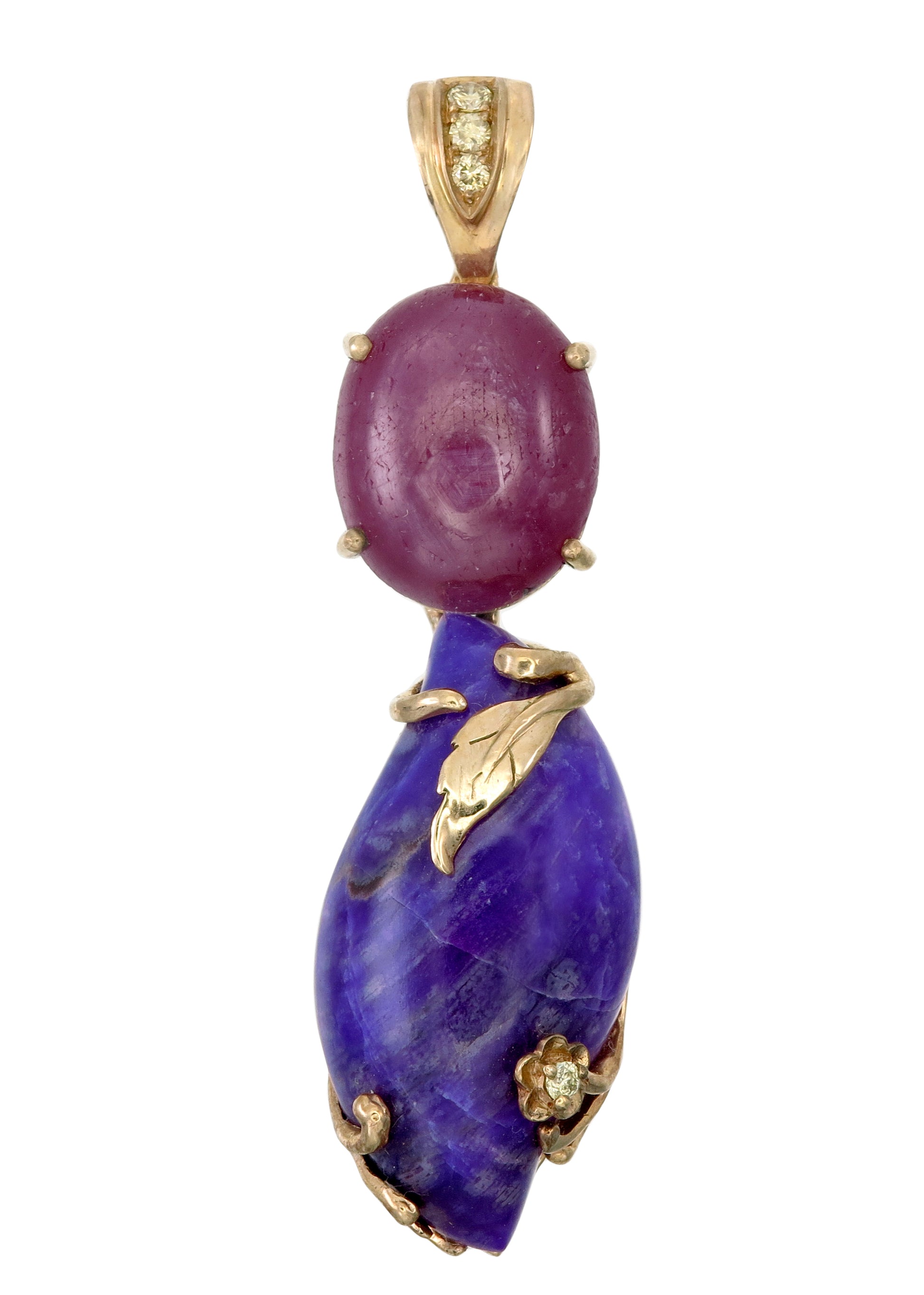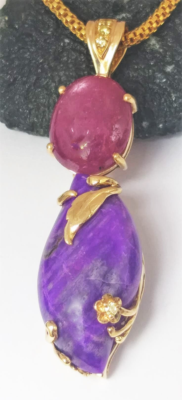 digging through our stone collection,,, we came across these two stones and really liked the combination... trying to figure out what to do with them, I had a vision,,, but it took a while to translate into a pendant,,, and I am not even sure I succeeded.. the vision was of an Apsara, the easiest explanation of this is to quote Wikipedia " An apsara, also spelled as apsaras , is a type of female spirit of the clouds and waters in Hindu and Buddhist culture. They figure prominently in the sculpture, dance, literature and painting of many South Asian and Southeast Asian cultures.... English translations of the word "Apsara" include "nymph", "fairy", "celestial nymph", and "celestial maiden".. explaining this to my goldsmith,,, he kind of got it, and together we came up with this piece that sort of dances.... there is a star in the ruby, however subtle, and it is a nice sugilite "mango shape", though not 'gel' or translucent,,, hence I set them in 9k gold... few little diamonds for added flair... in~joy ya'all ❣️💜Jai 108💜❣️