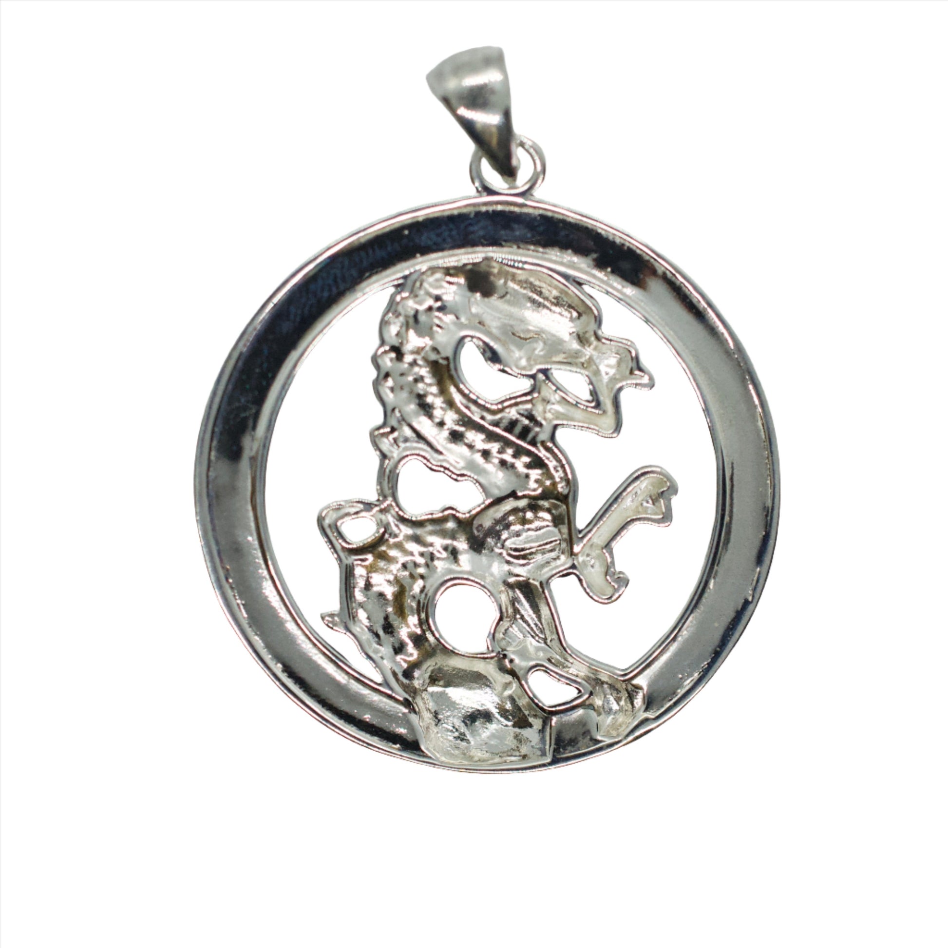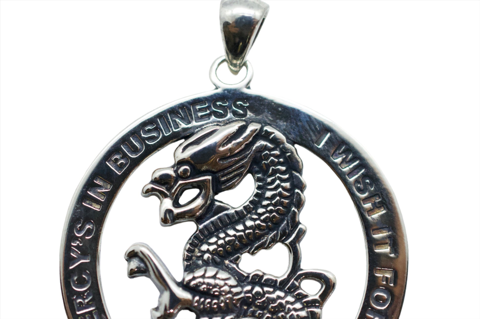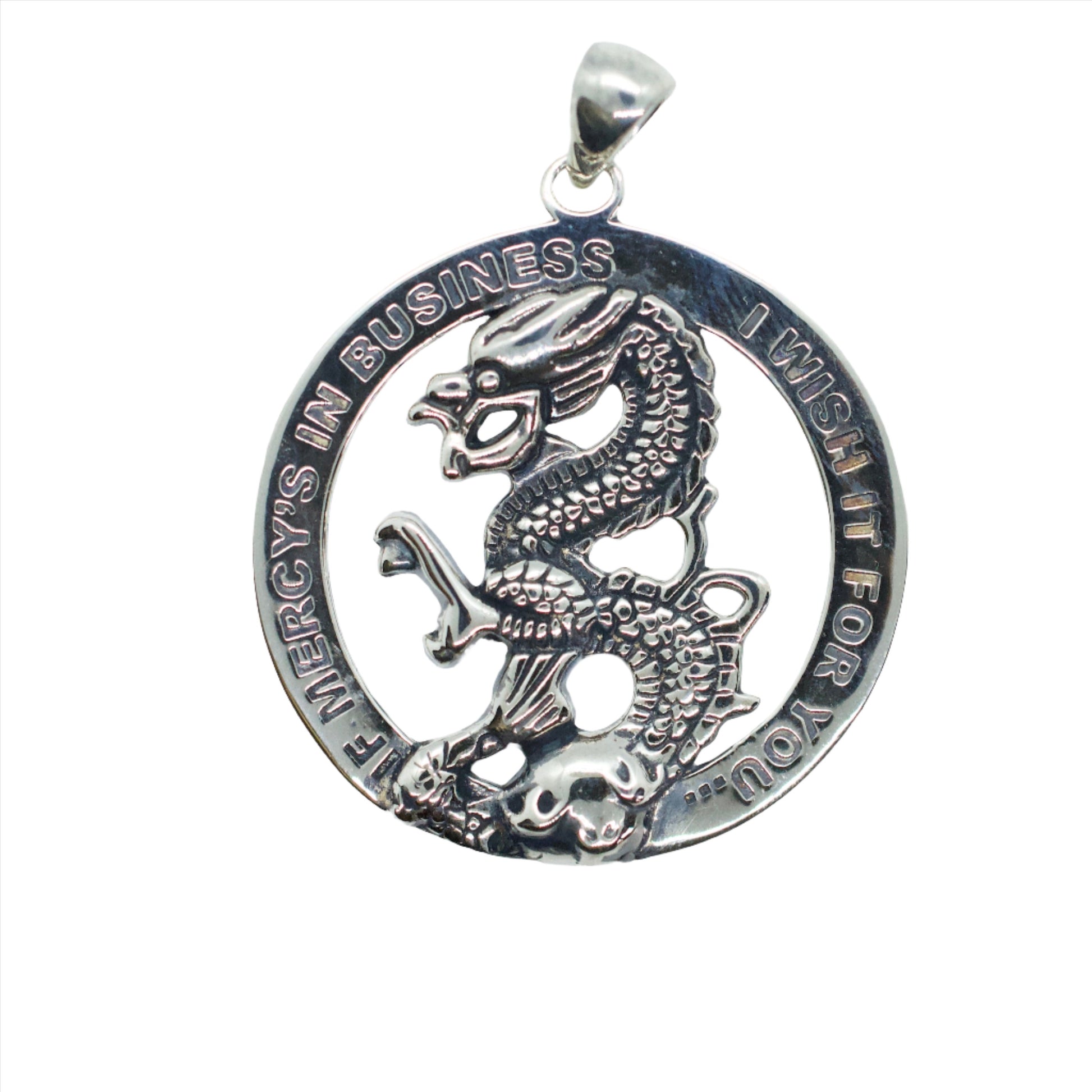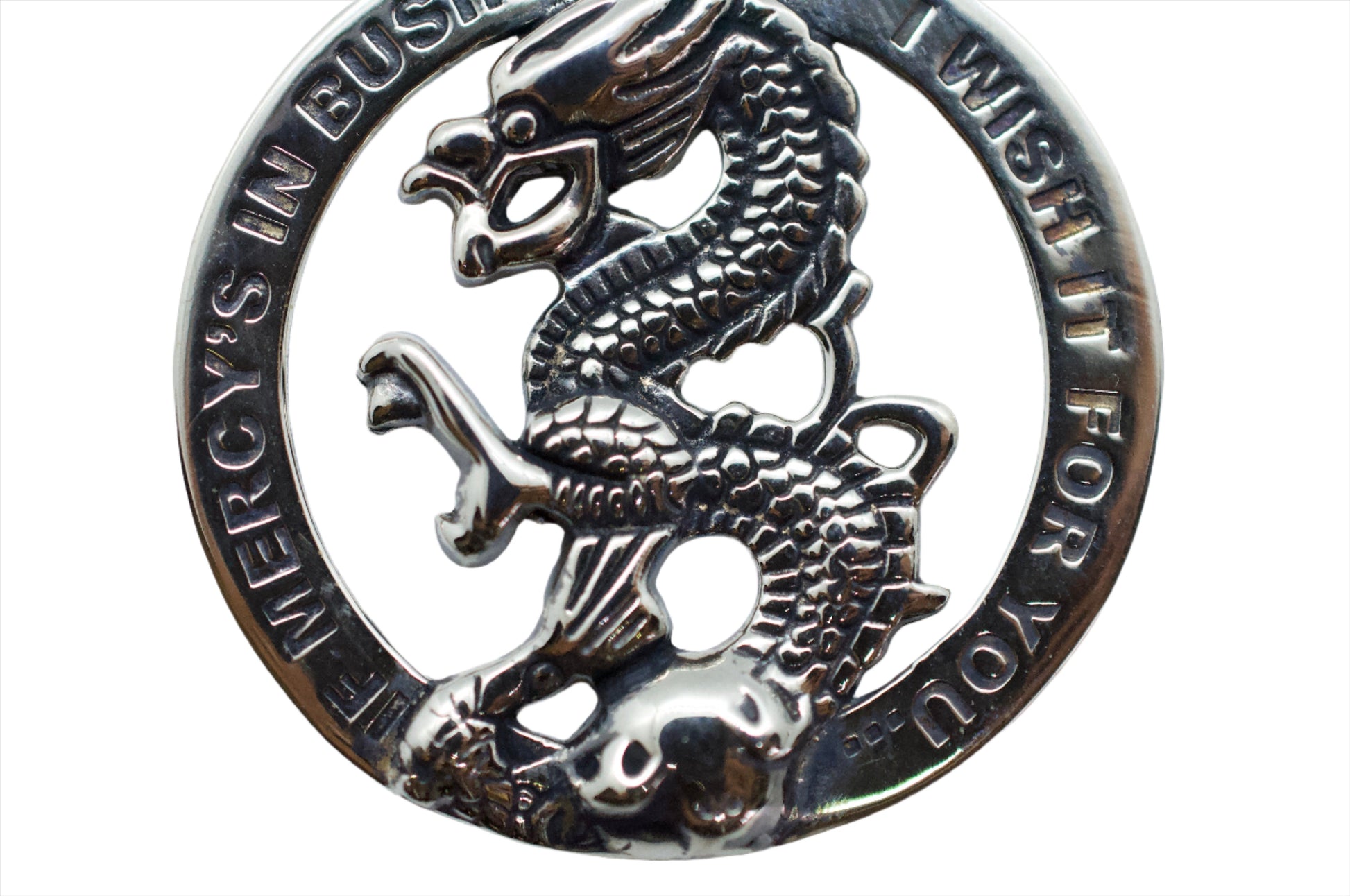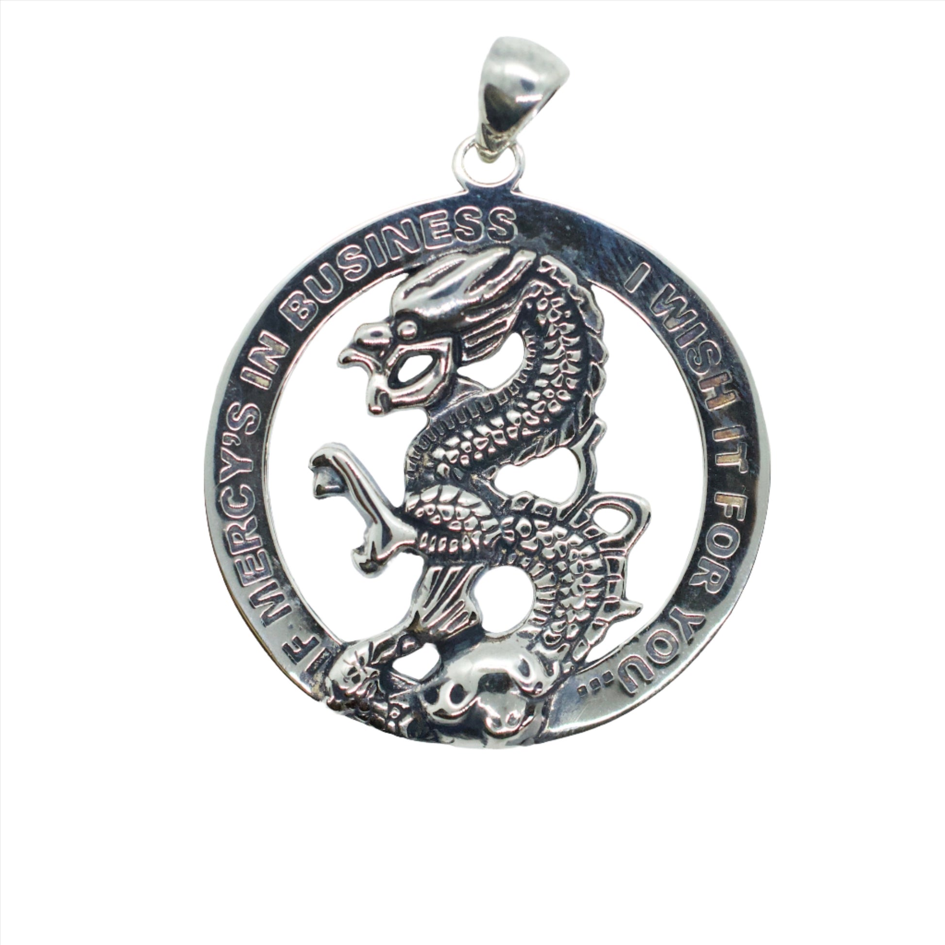 This unique sterling silver Fire on the Mountain pendant features an intricately detailed dragon surrounded by lyrics from one of our favorite songs. "If Mercy's a business, I wish it for you." It measures 1.5 inches in diameter.