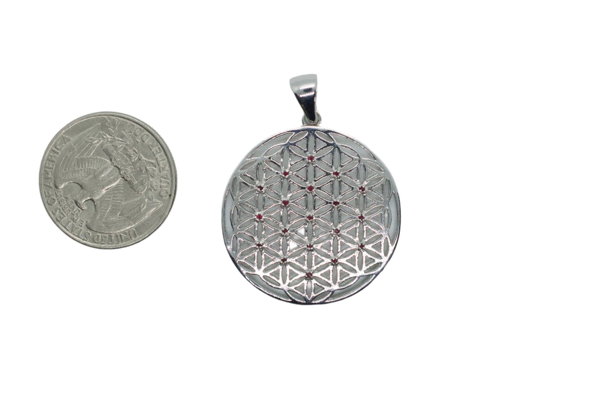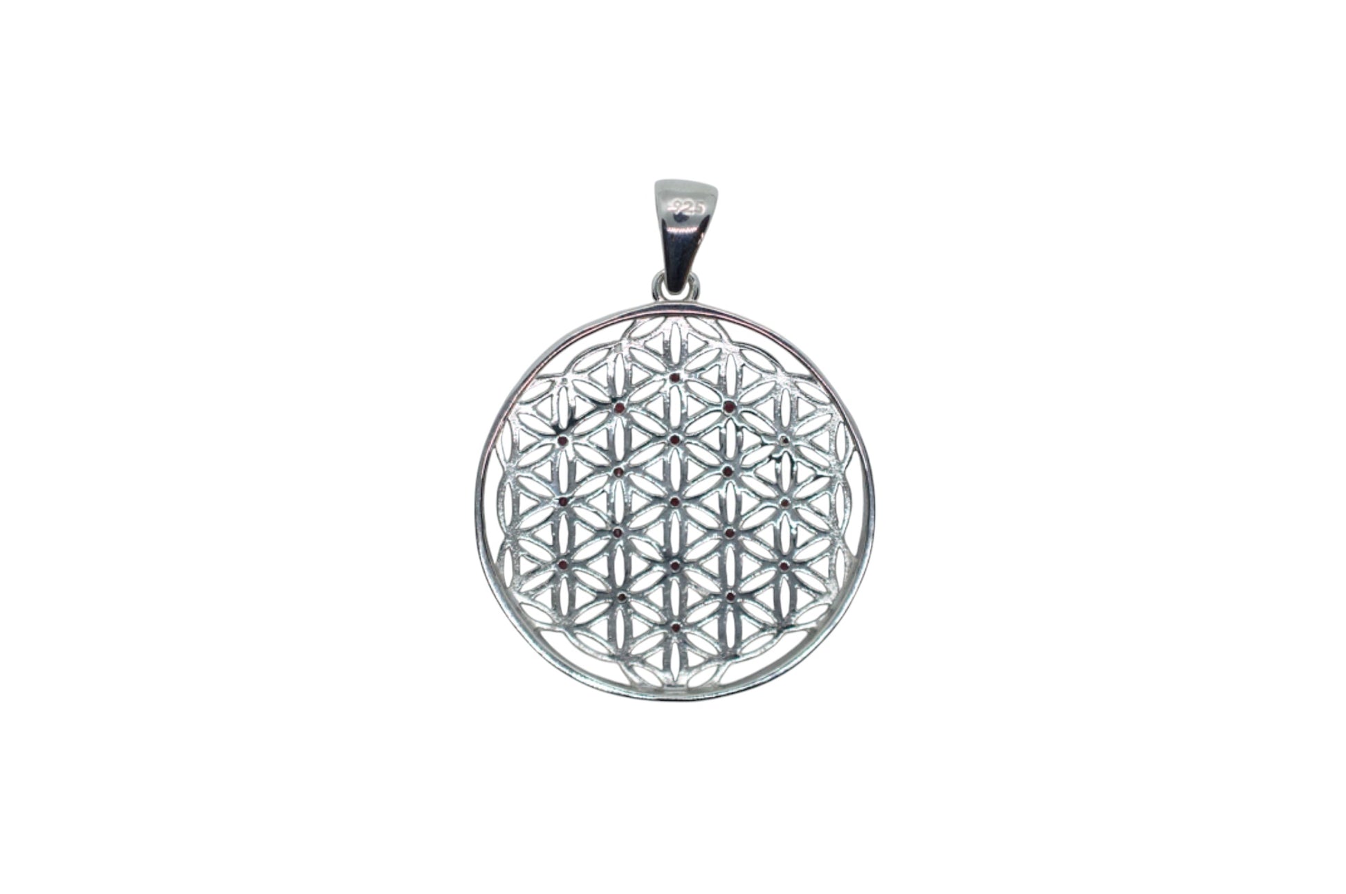 Featuring little seed garnet gems, this beautiful sacred geometry pendant is made of 925 sterling silver. It's about 1 1/4" in diameter.