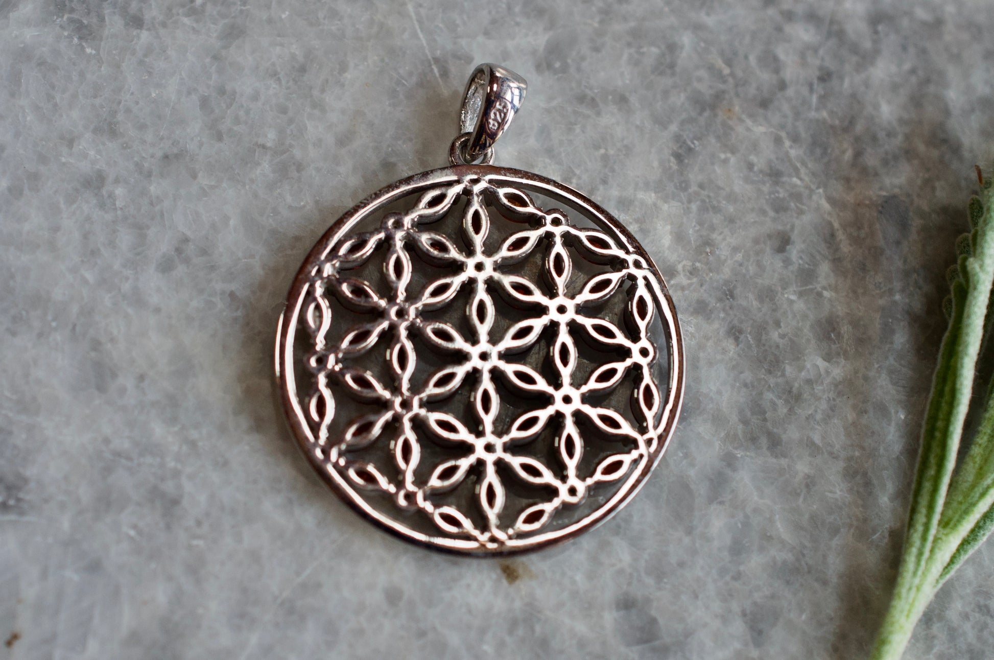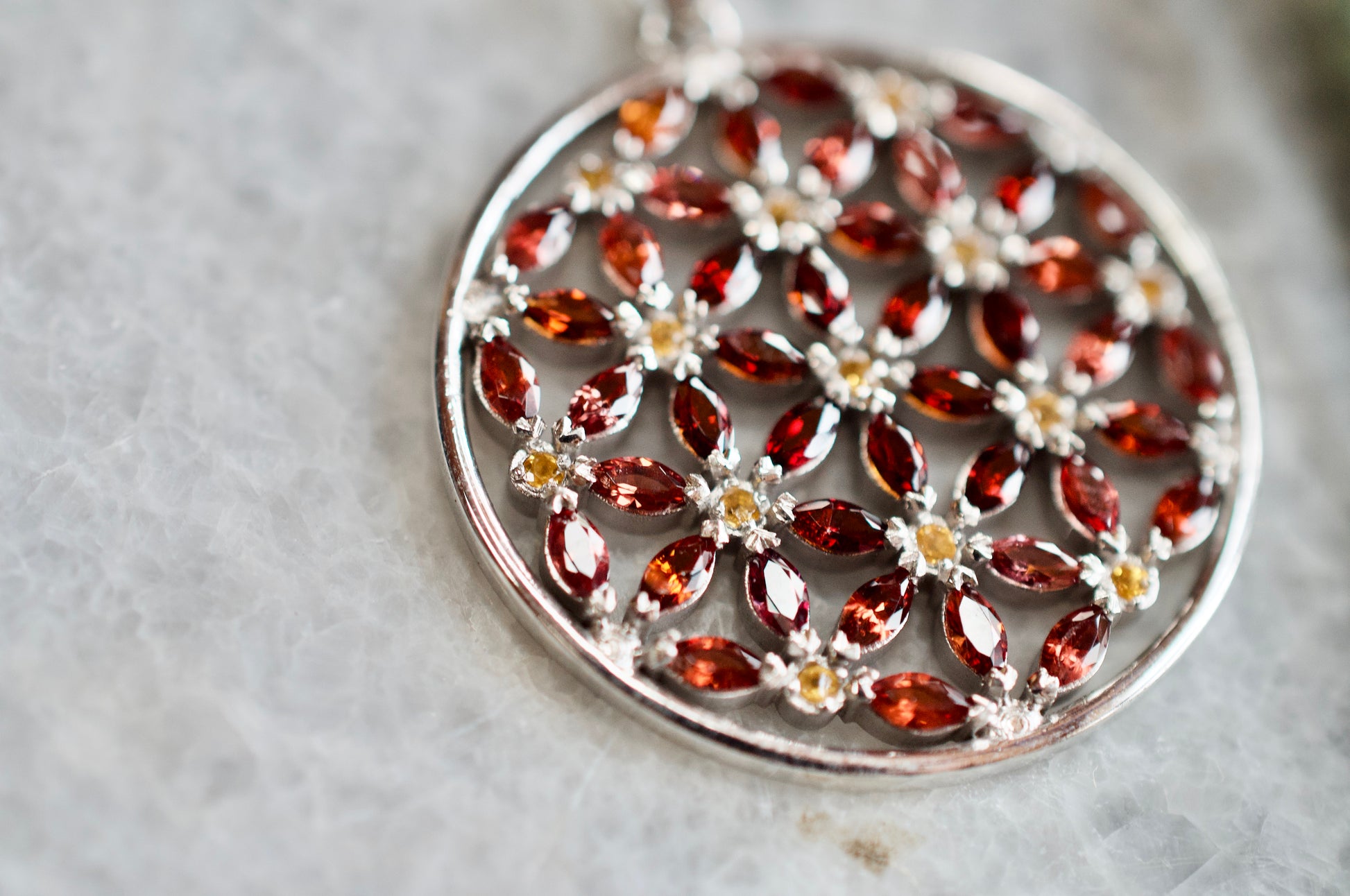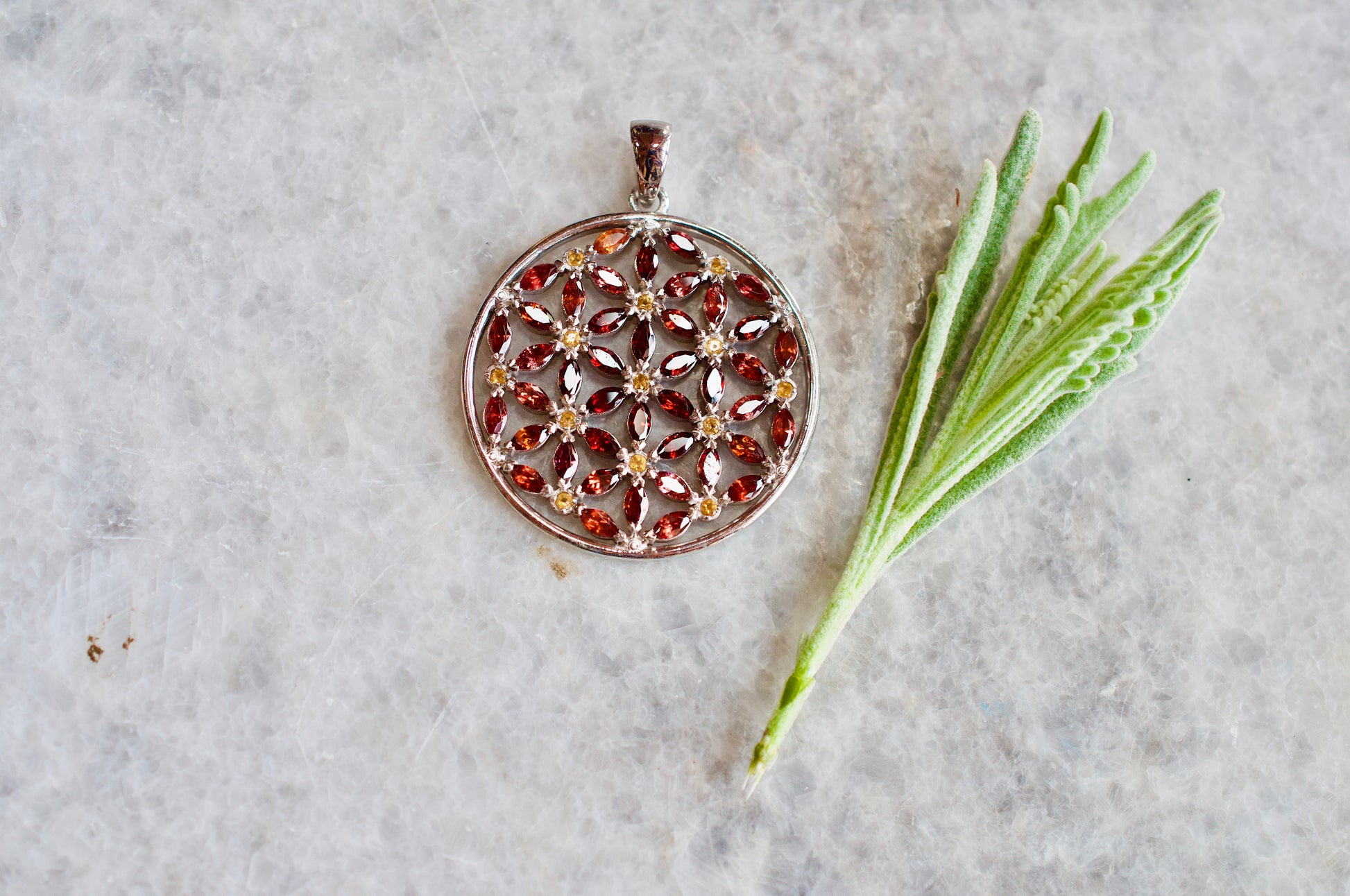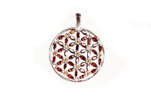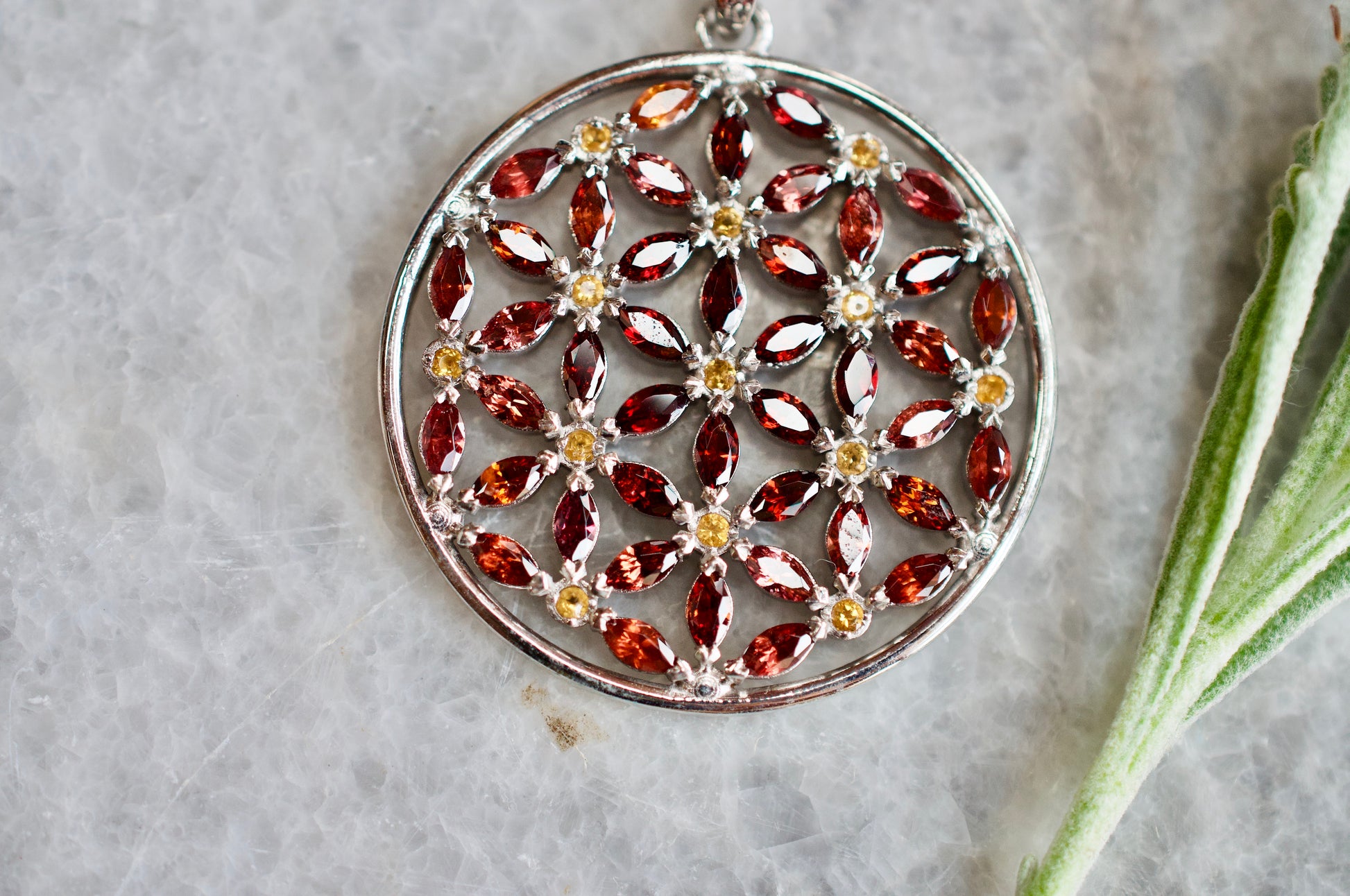 Garnet and Citrine Marquis Flower of Life Silver Necklace