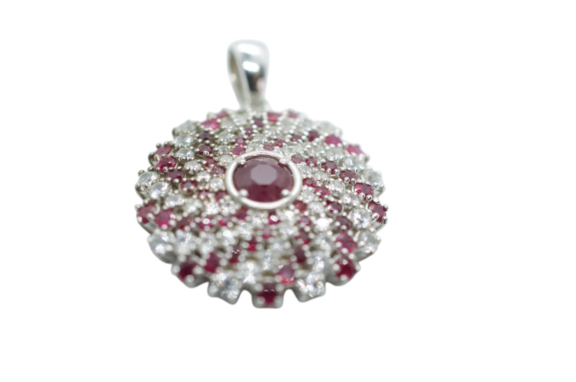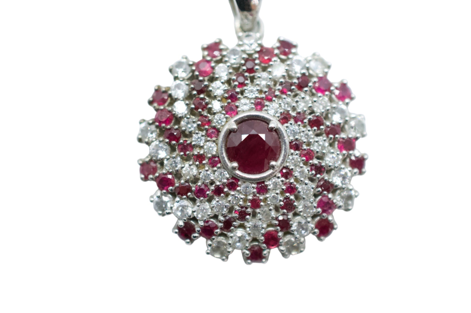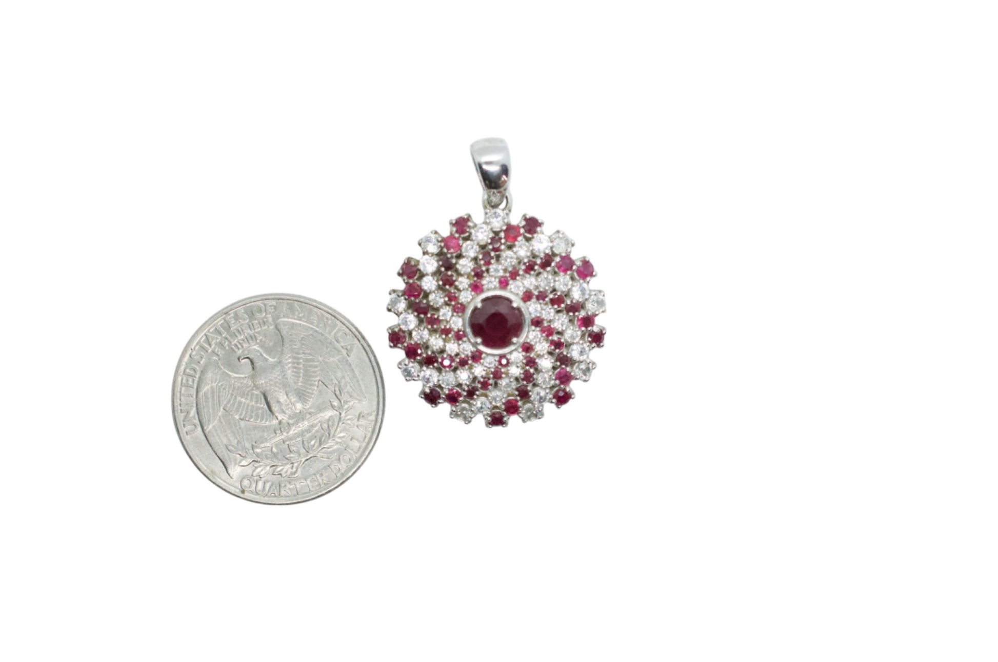 108 stones surround a deep red garnet. This pendant measures less than 1". The exquisite arrangement and colors bring us peace.