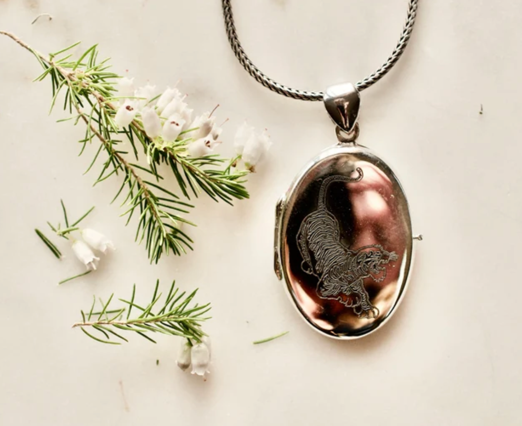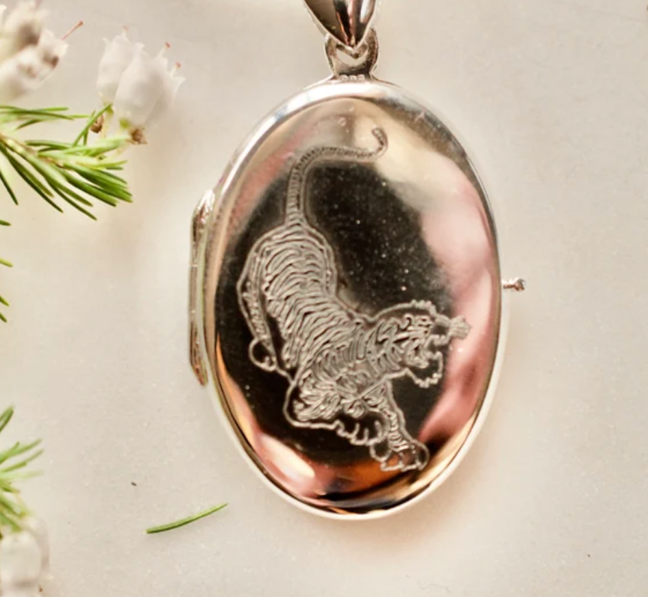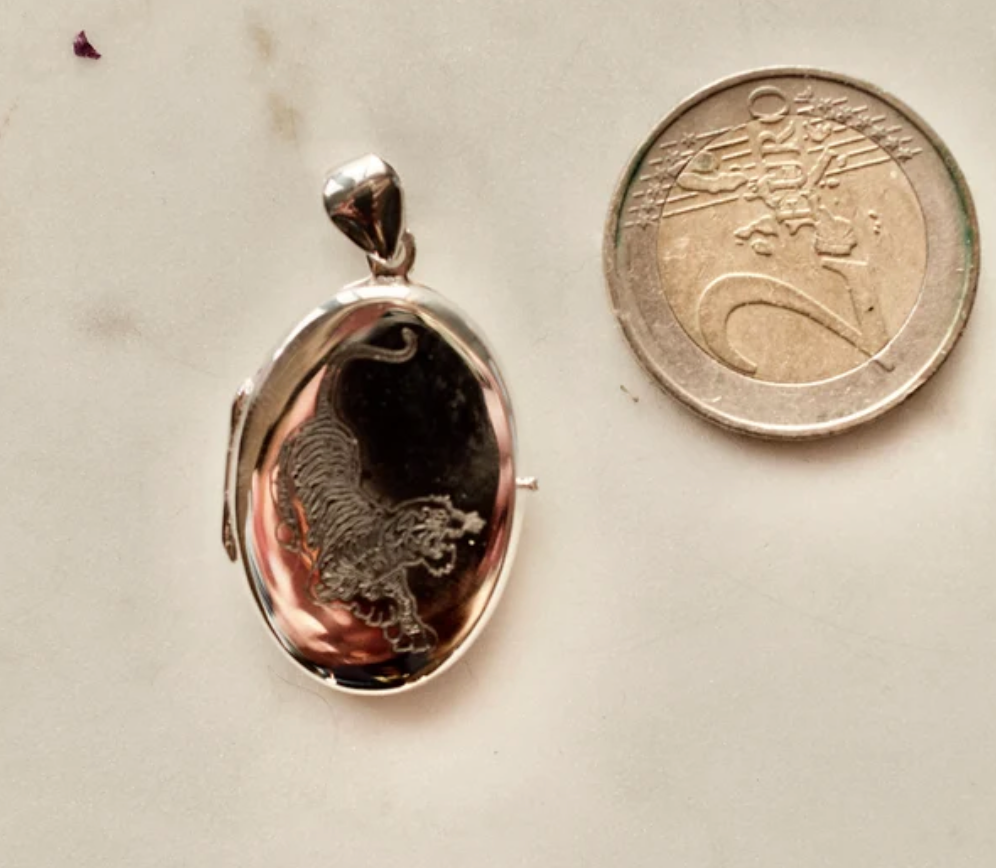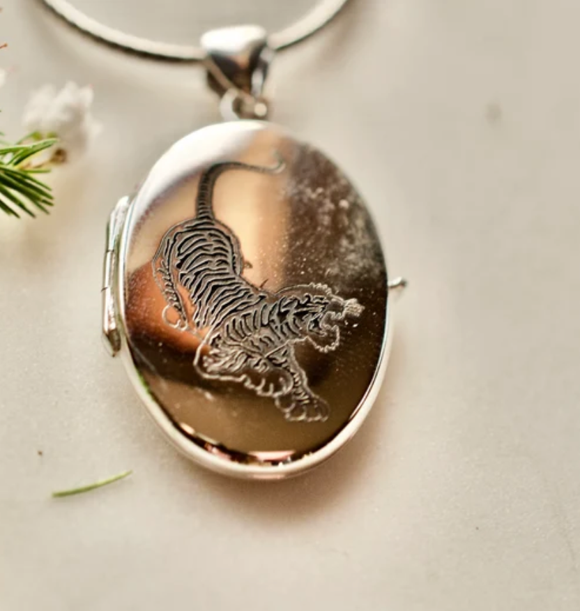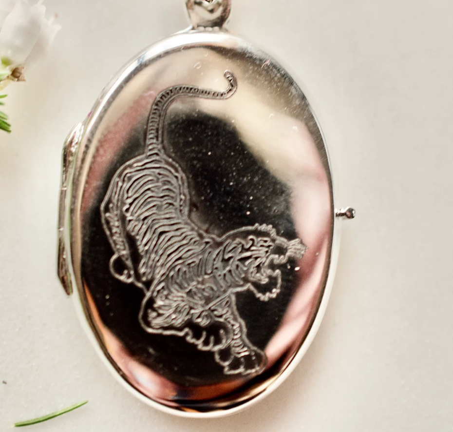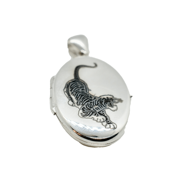 This unique locket features an engraved tiger from Jerry's Irwin guitar.