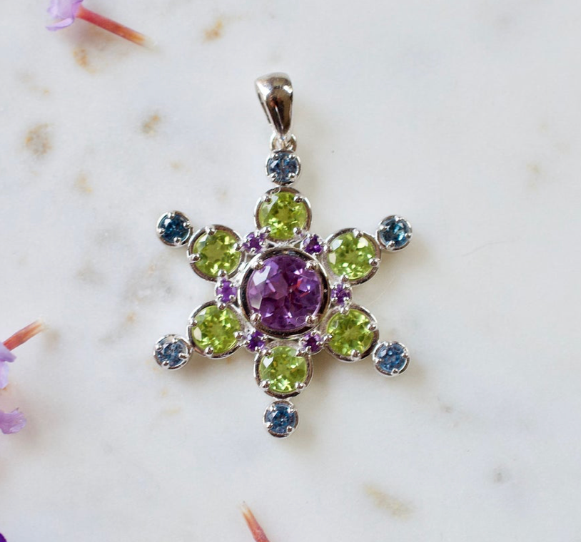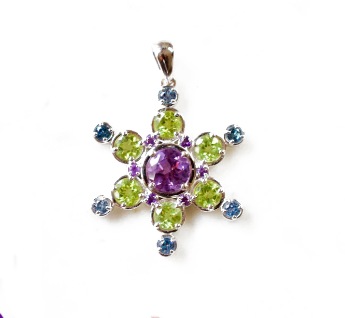 June Mt. Snowflake Amethyst Peridot Topaz Silver Pendant Necklace
