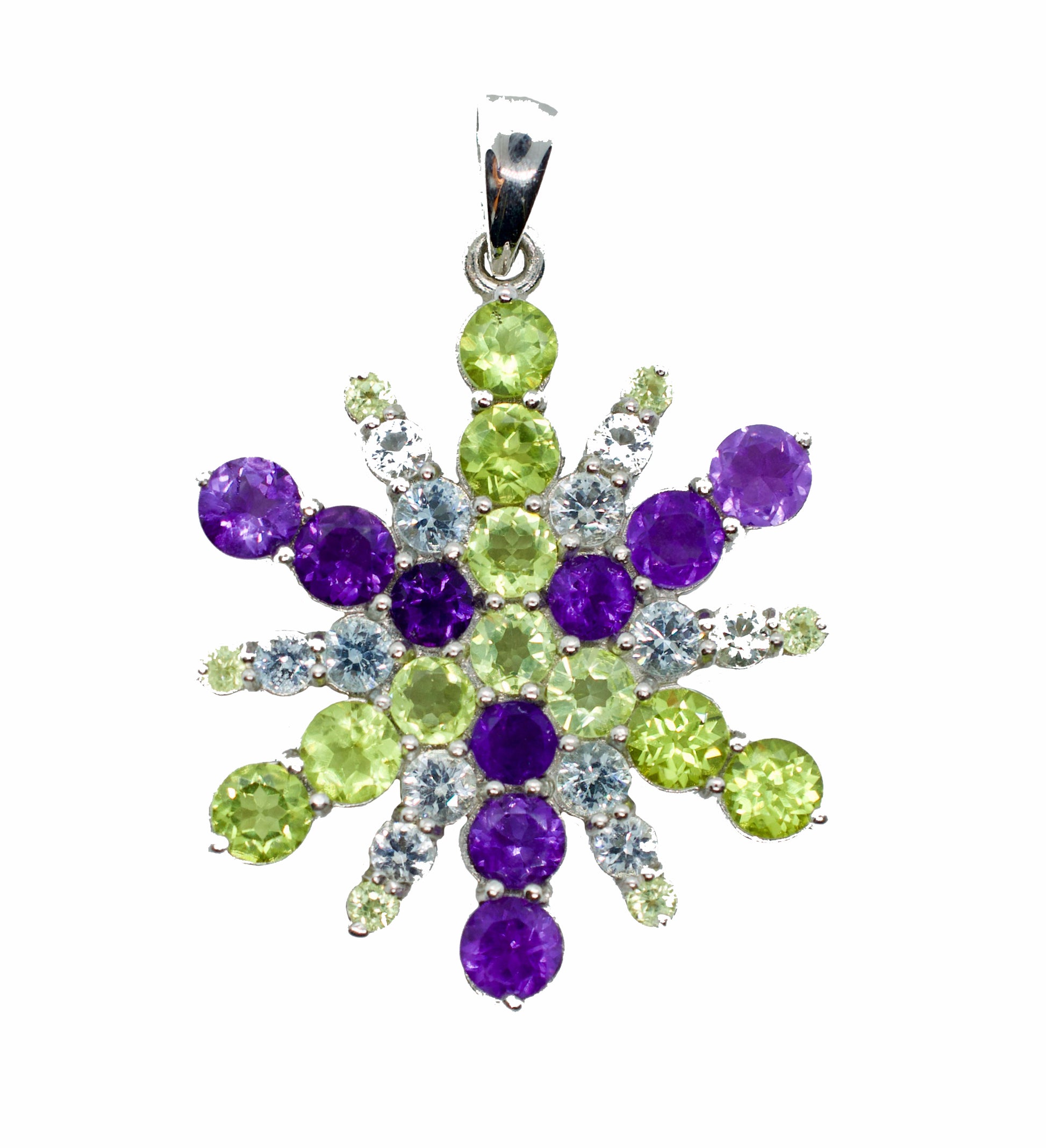 37 exquisite gemstones are arranged in a beautiful snowflake design in this unique piece of fine jewelry we named after Lake Louise in Alberta, Canada. Featuring peridot, amethyst, and natural white zircon, this pendant sparkles in so many ways.