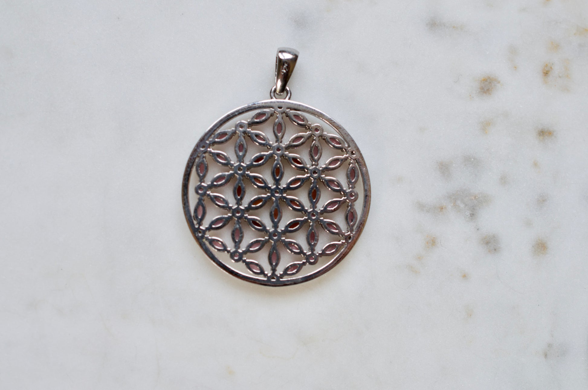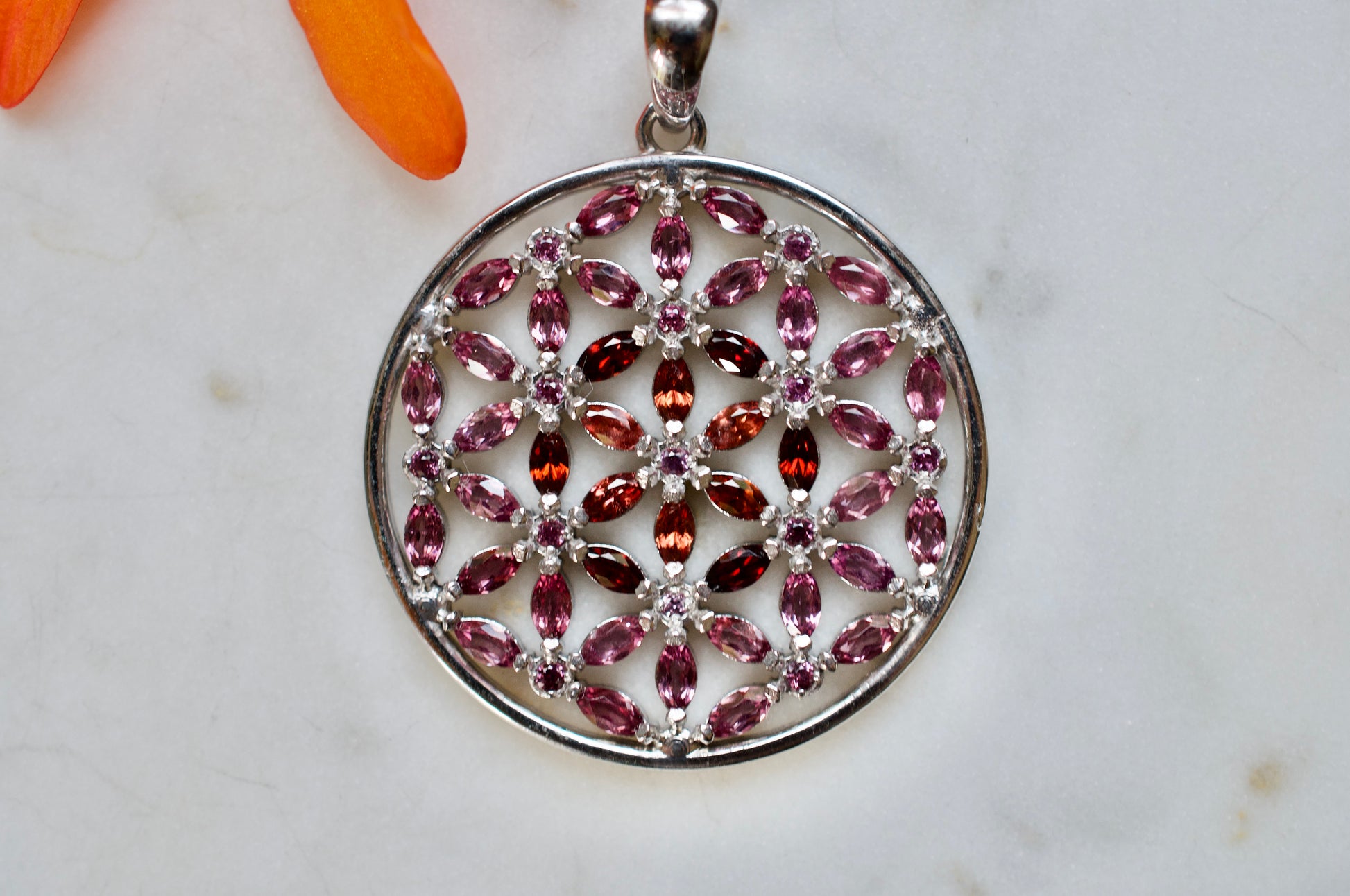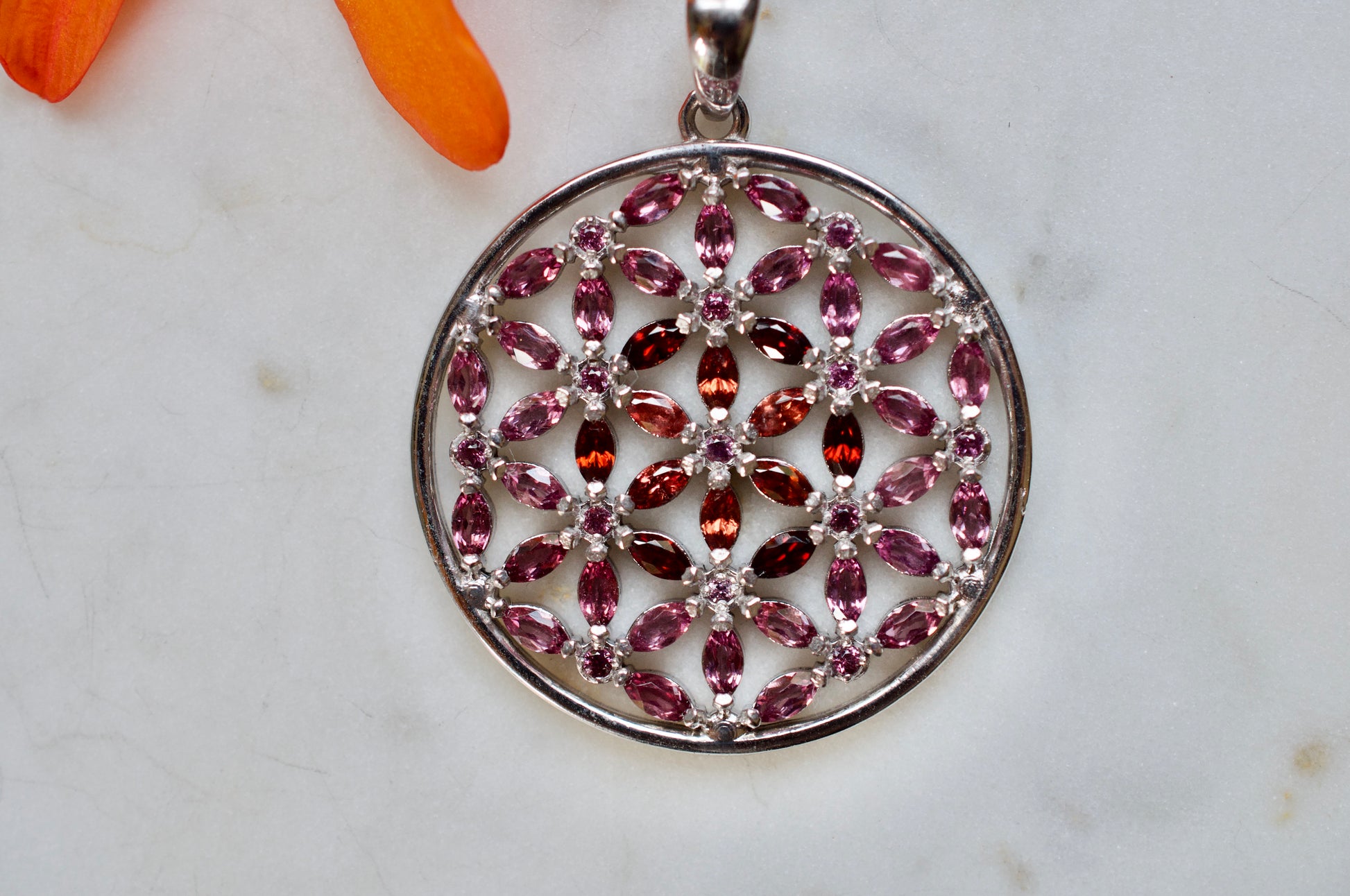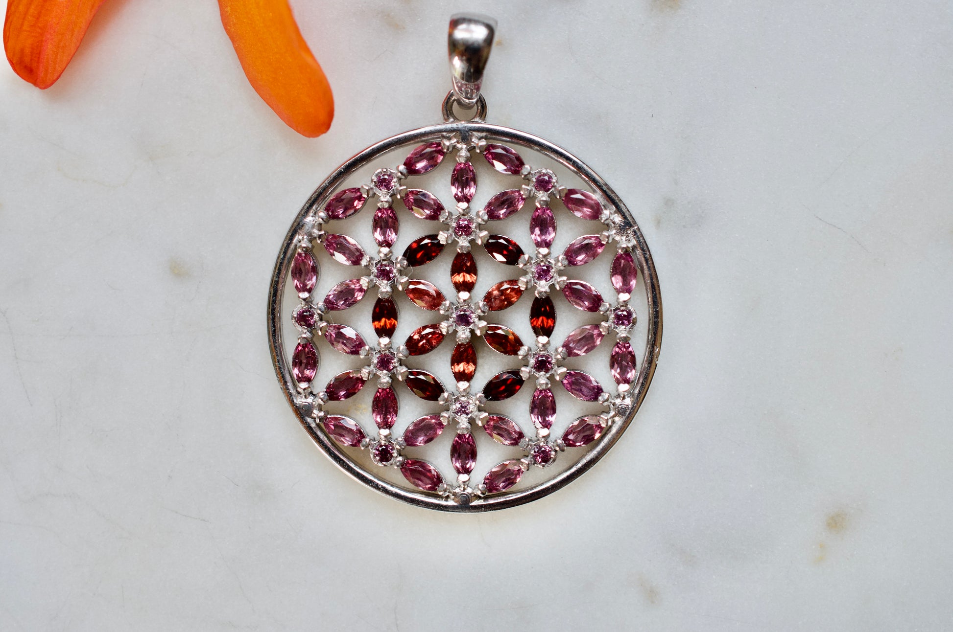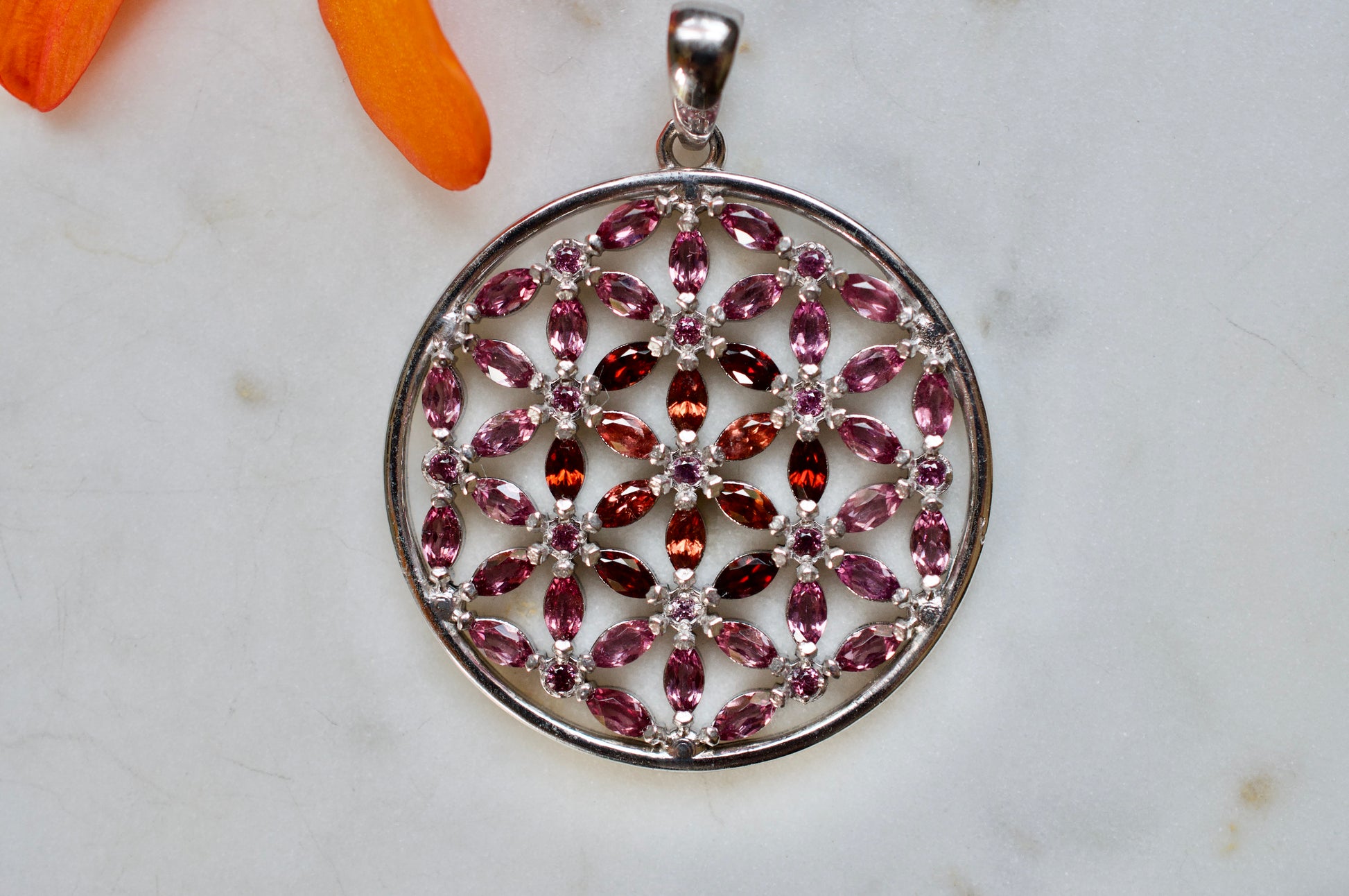 Marquis Flower of Life Sterling Silver Necklace Featuring Garnet and Rhodolite Garnet