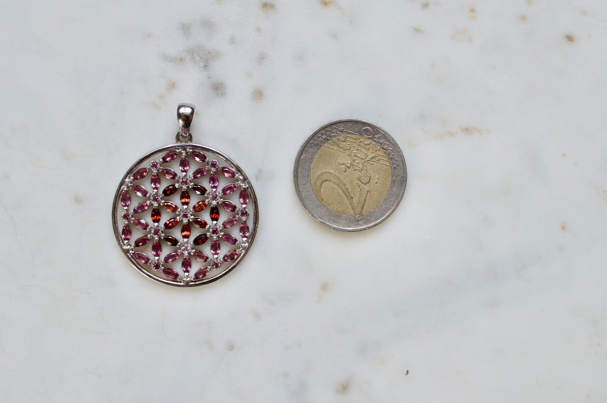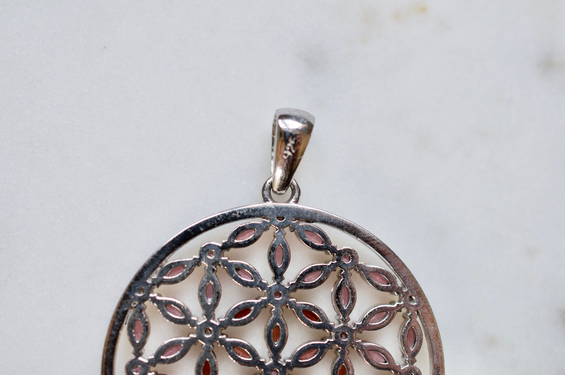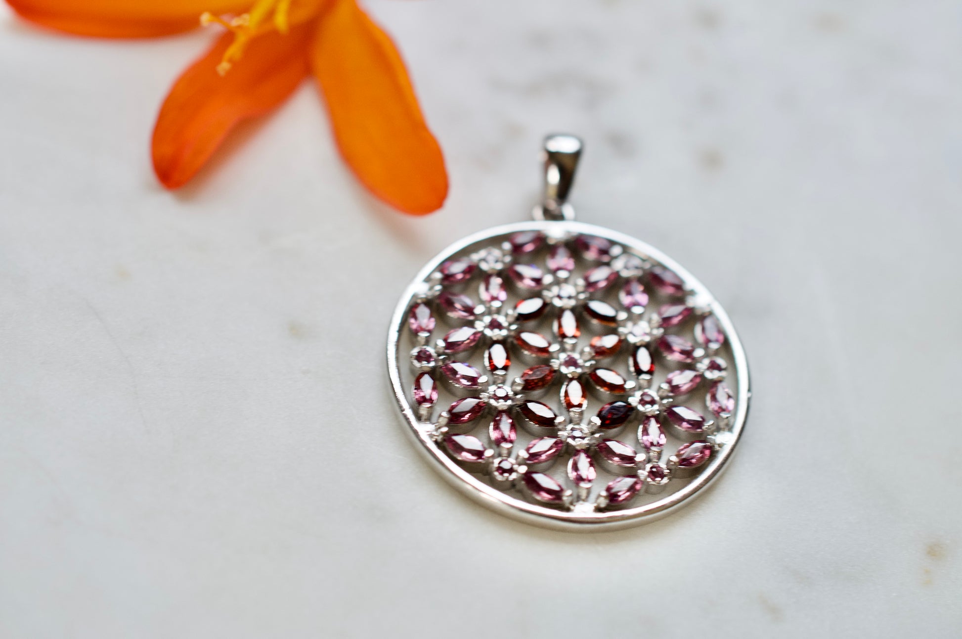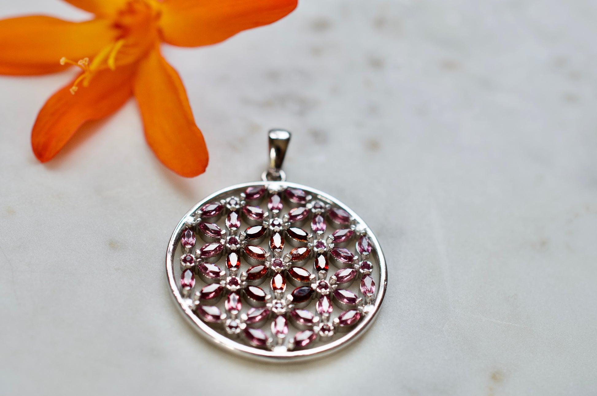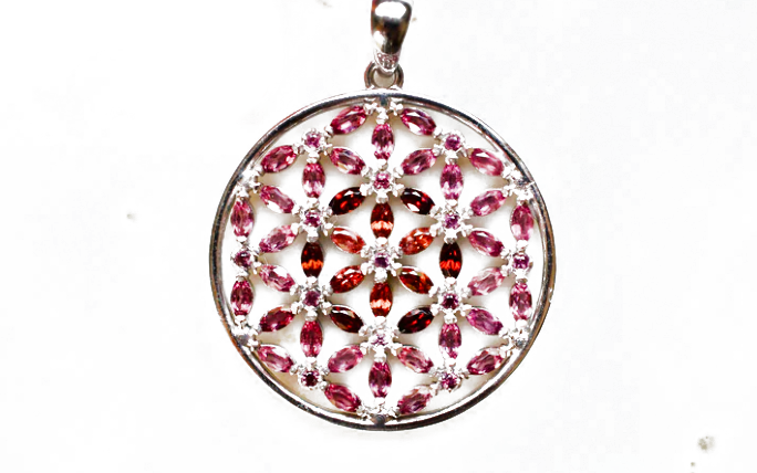 Marquis Flower of Life Sterling Silver Necklace Featuring Garnet and Rhodolite Garnet