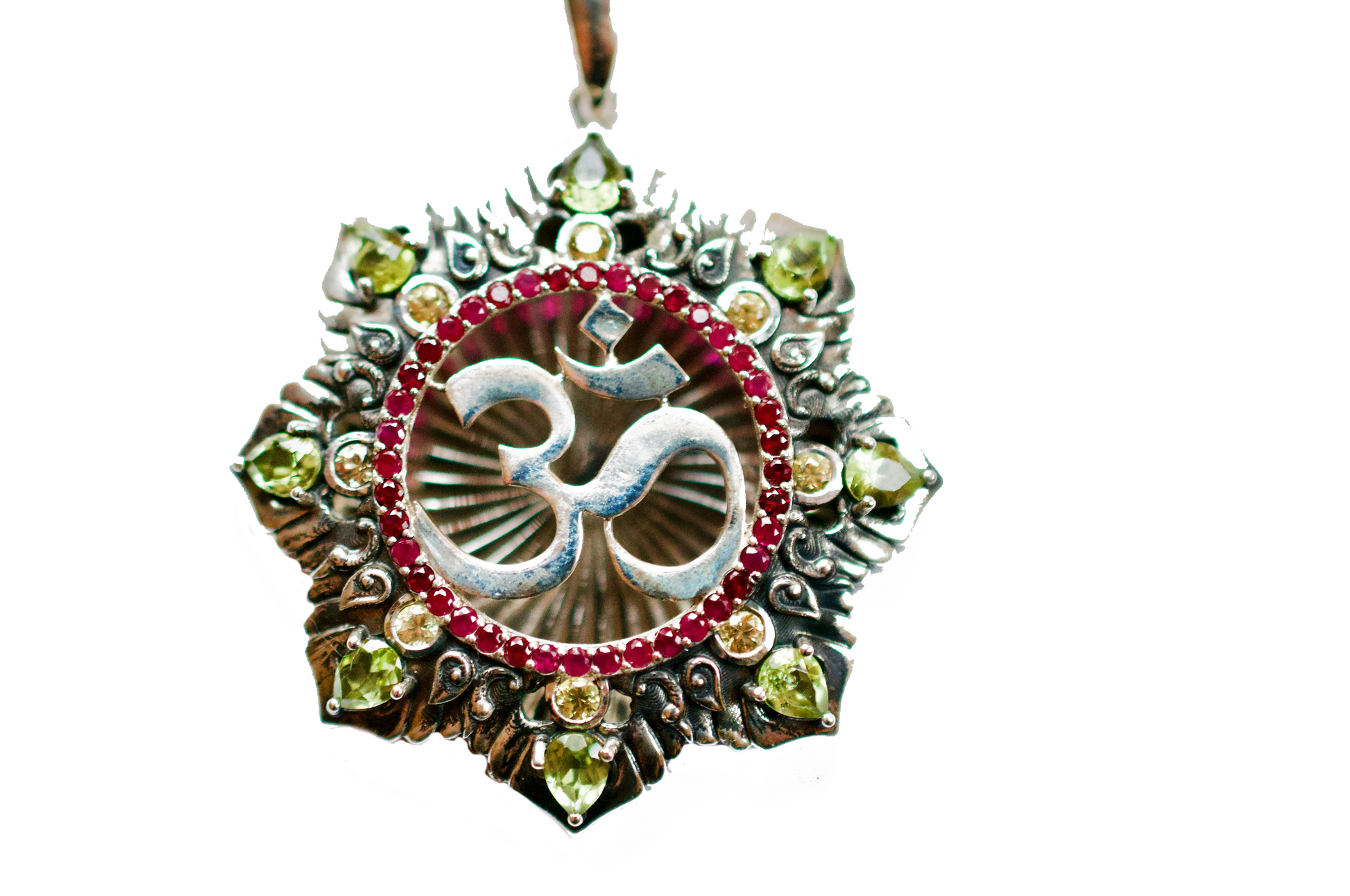This stunningly unique Om pendant measures 1.25 inches across and features rubies, peridot, and yellow sapphires set in sterling silver.