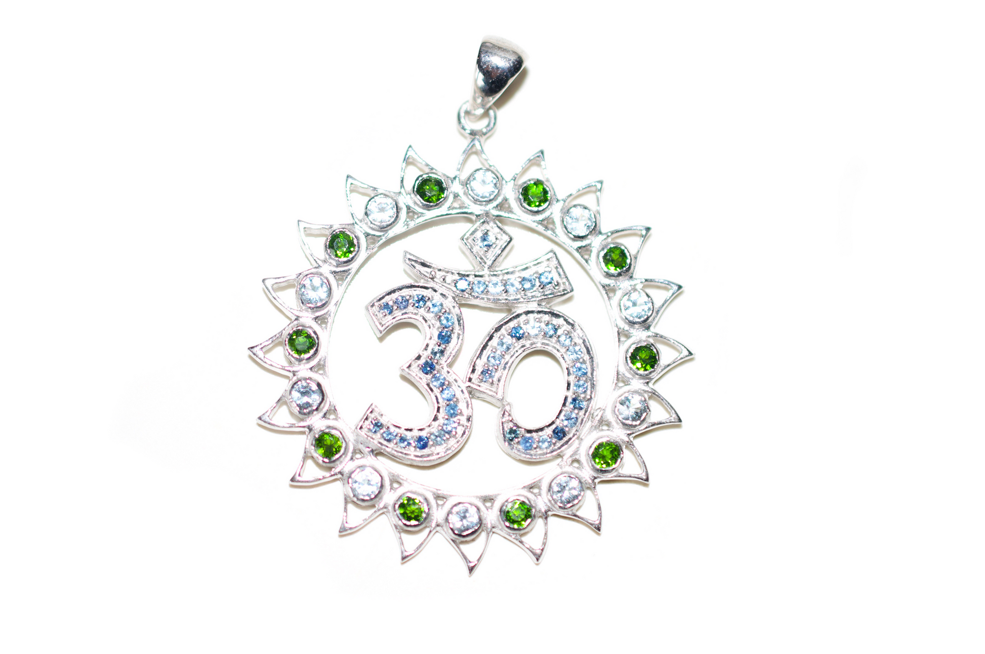 This dazzling version of our Om pendant comes adorned with chrome diopside, aquamarine, and blue sapphire gemstones.