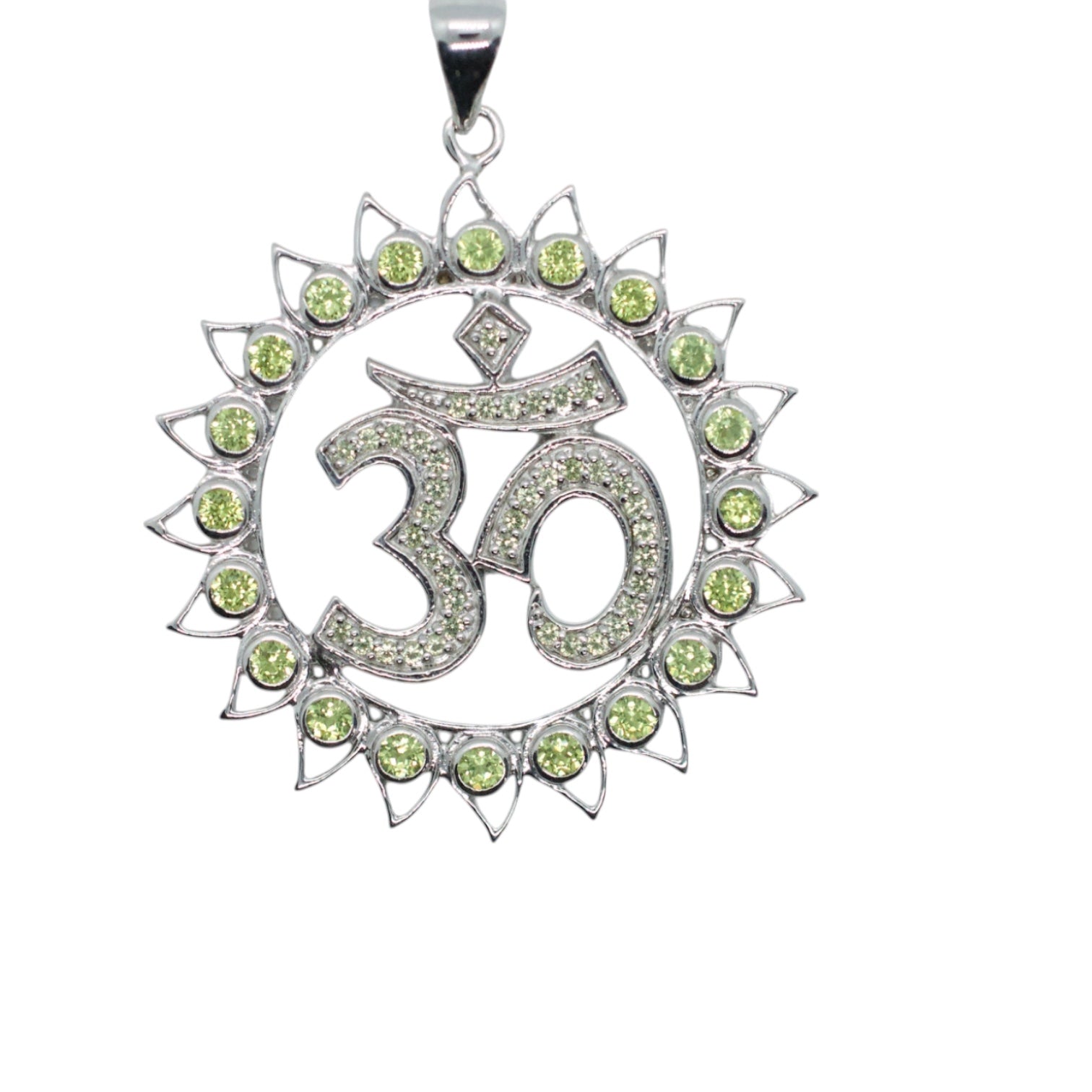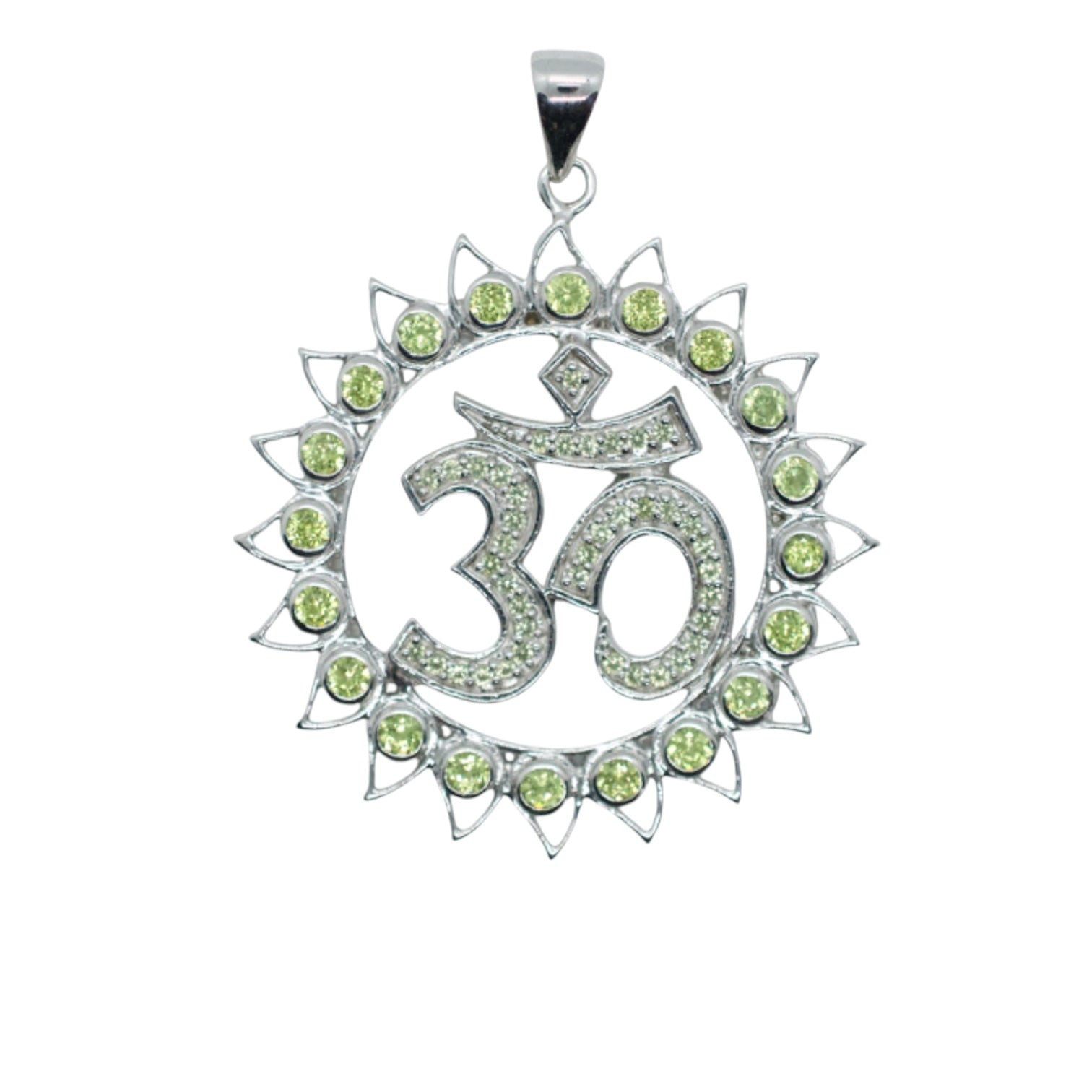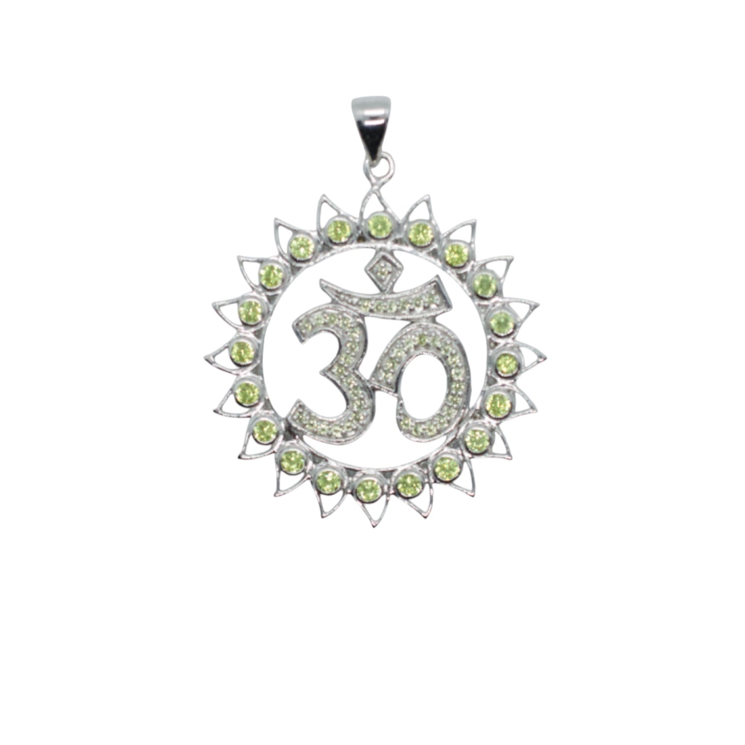 Om Shanti Lotus Gemmed Sterling Silver Pendant Peridot & Green Sapphire