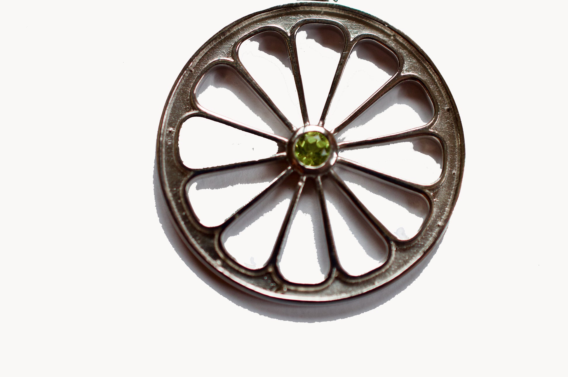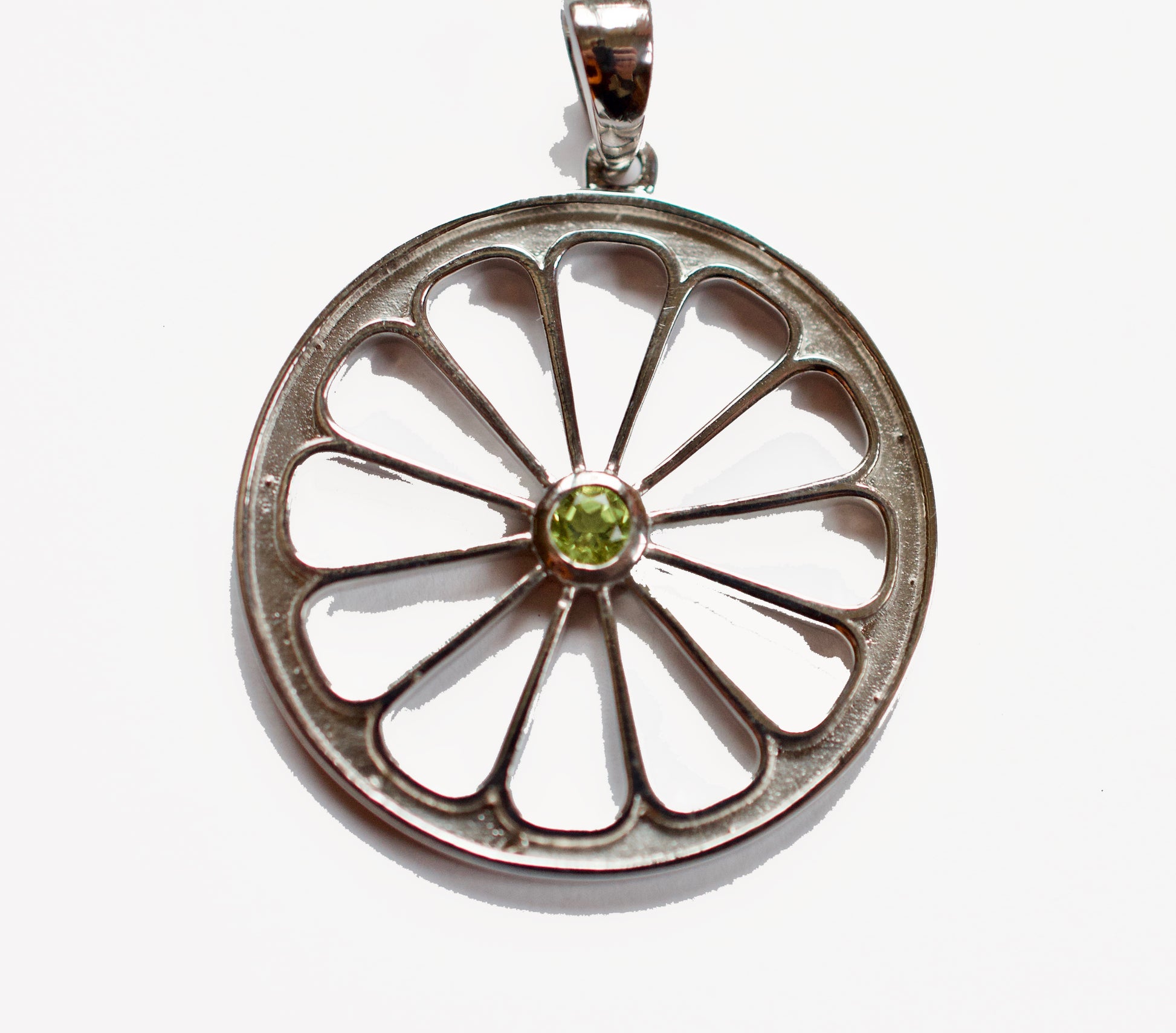 Inspired by the sacred geometry found in the foods we eat, our Citrus Silver Pendant features a peridot "seed" in the middle. This piece is so juicy and unique, you will enjoy your friends' comments as they try and guess the inspiration.