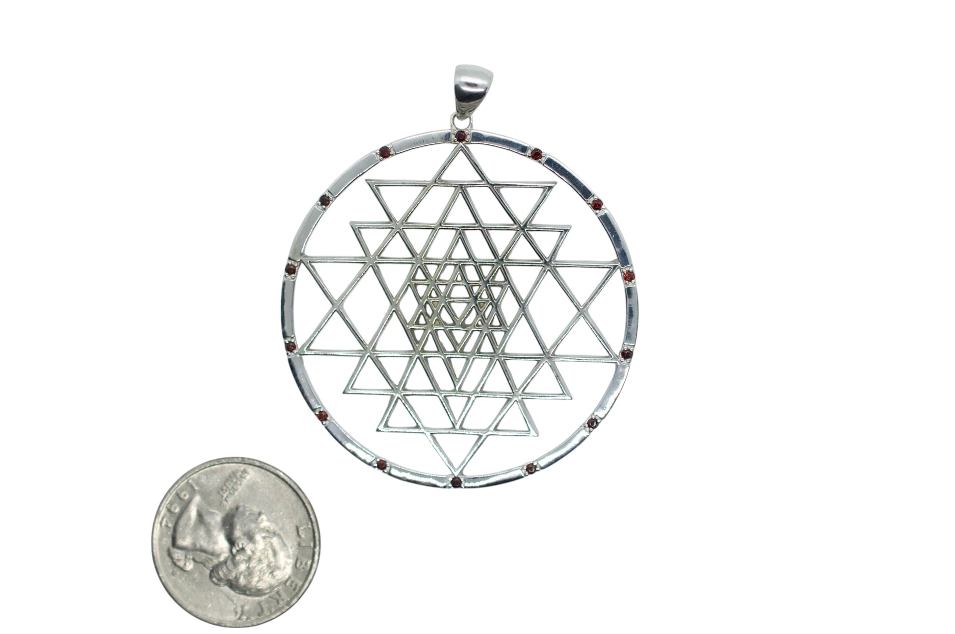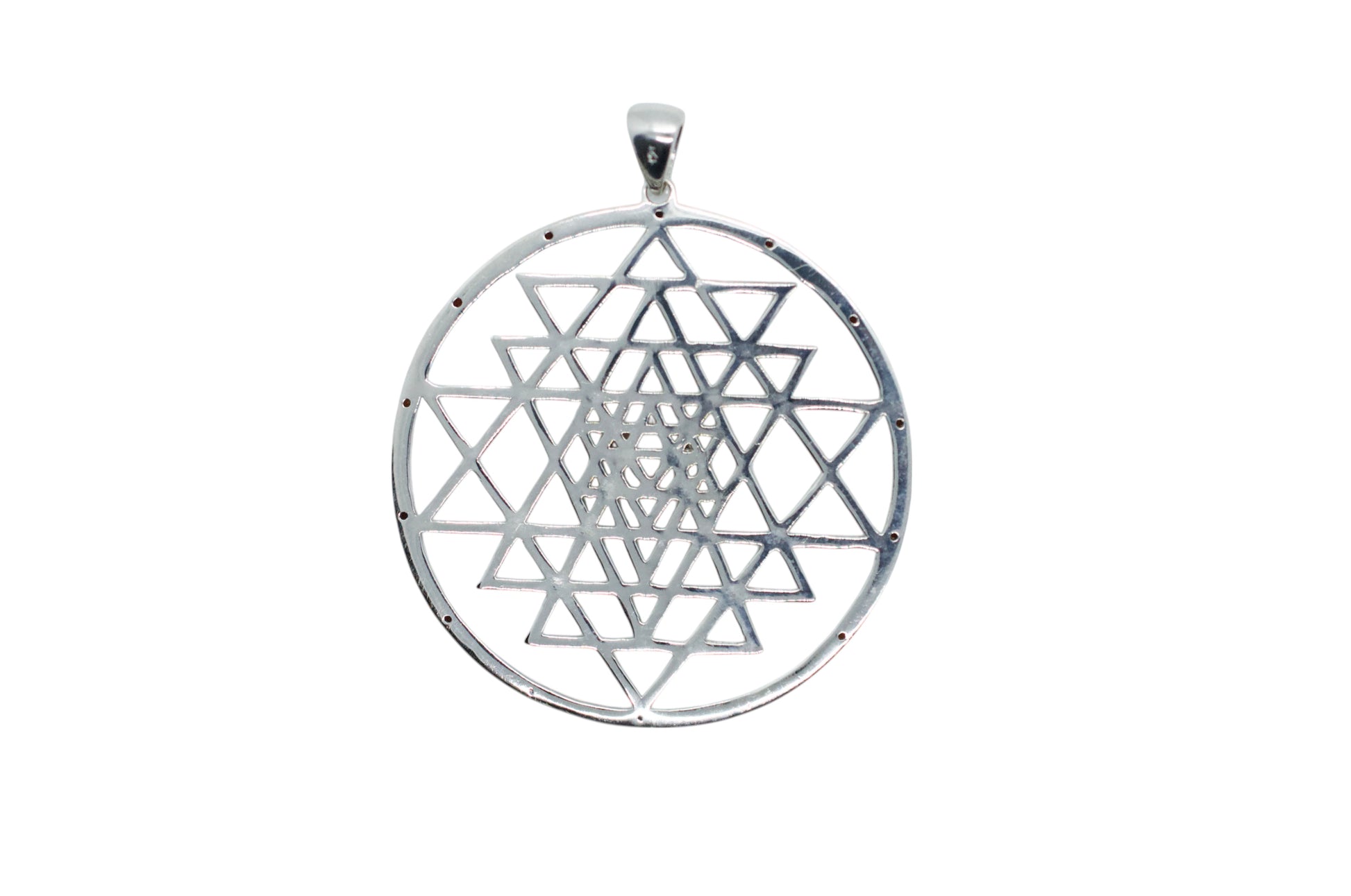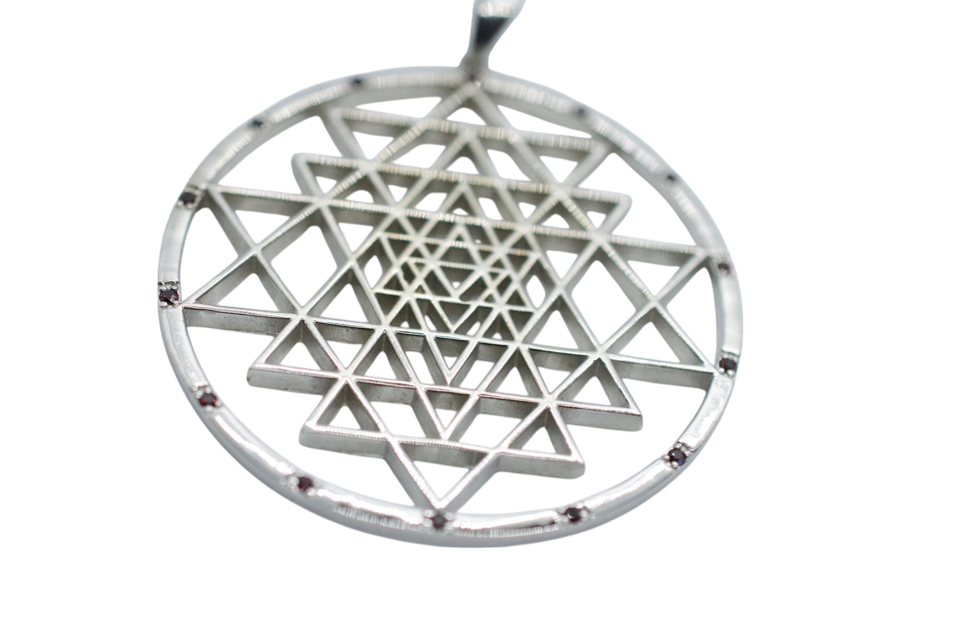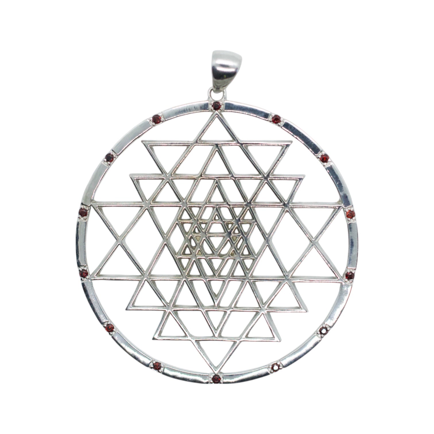 Meticulously crafted in sterling silver, this sacred pendant features the revered Sri Yantra—an intricate geometric symbol of harmony, abundance, and spiritual power. 14 brilliant natural rubies, a gemstone known for its energy of passion, protection, and vitality, surround the sacred geometry.