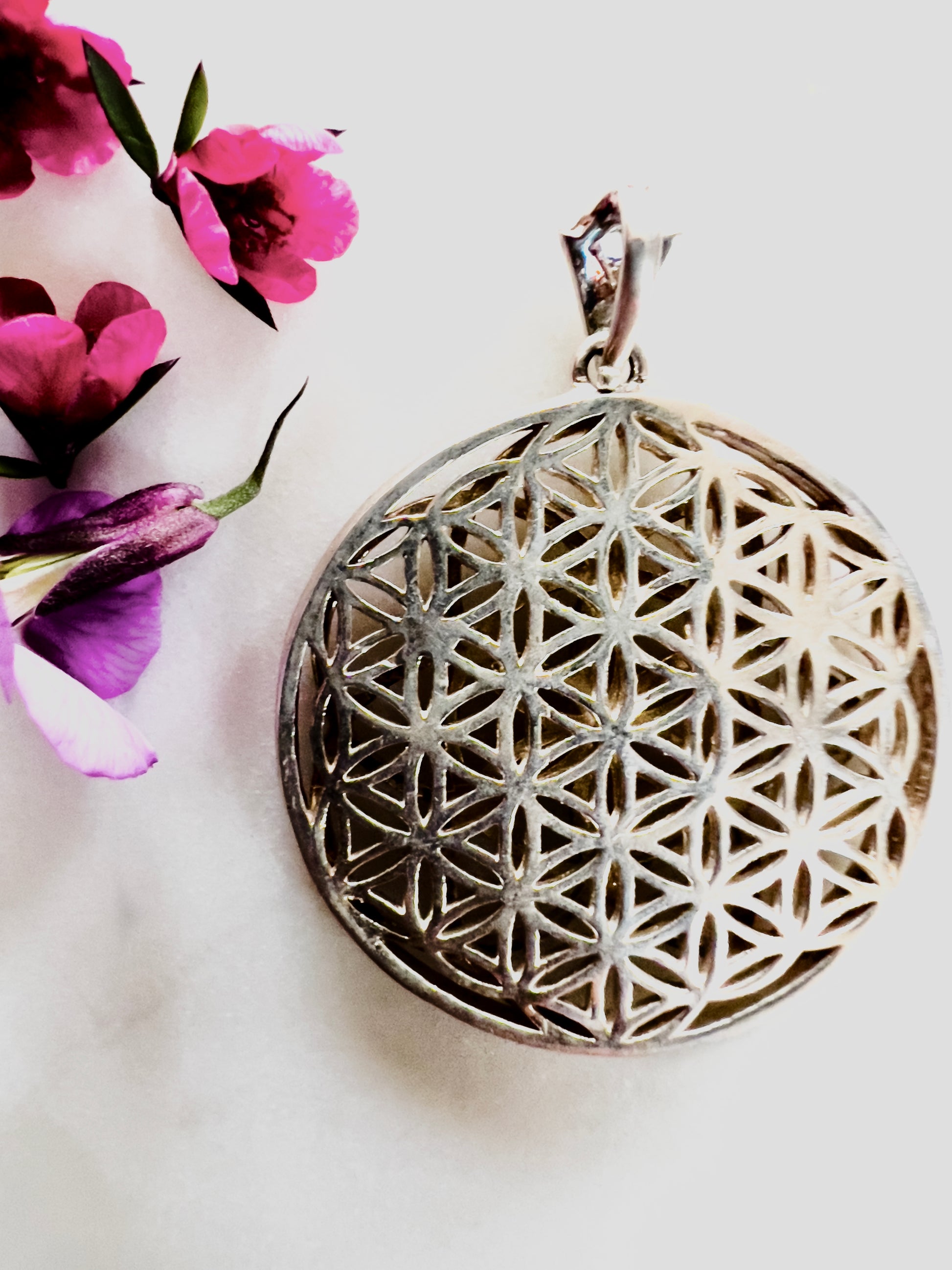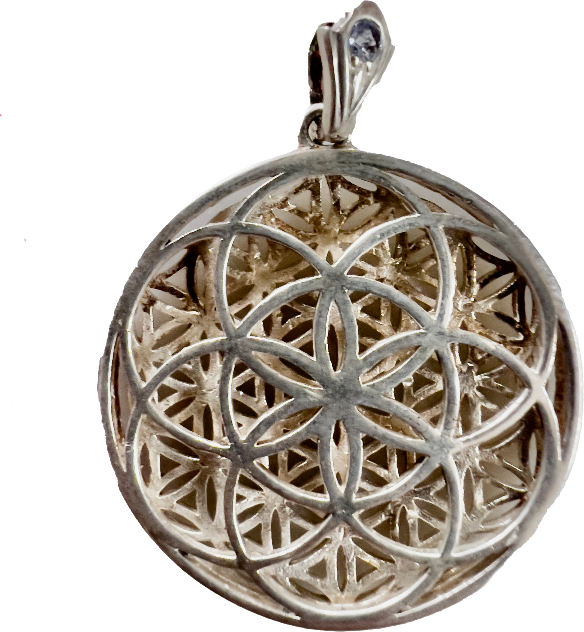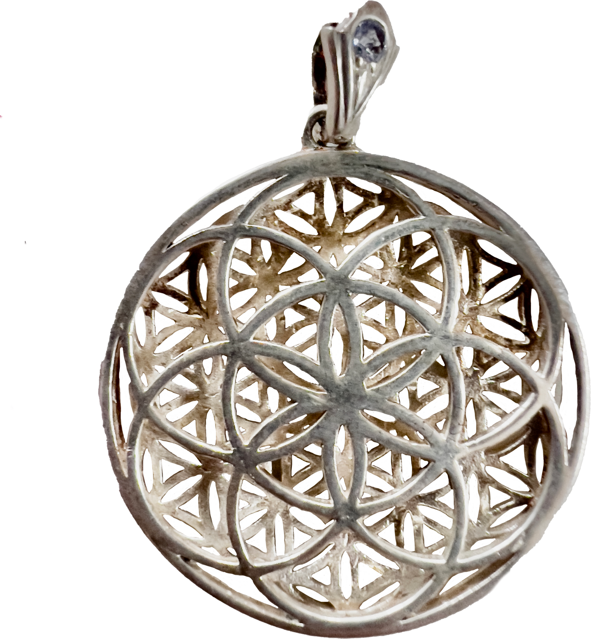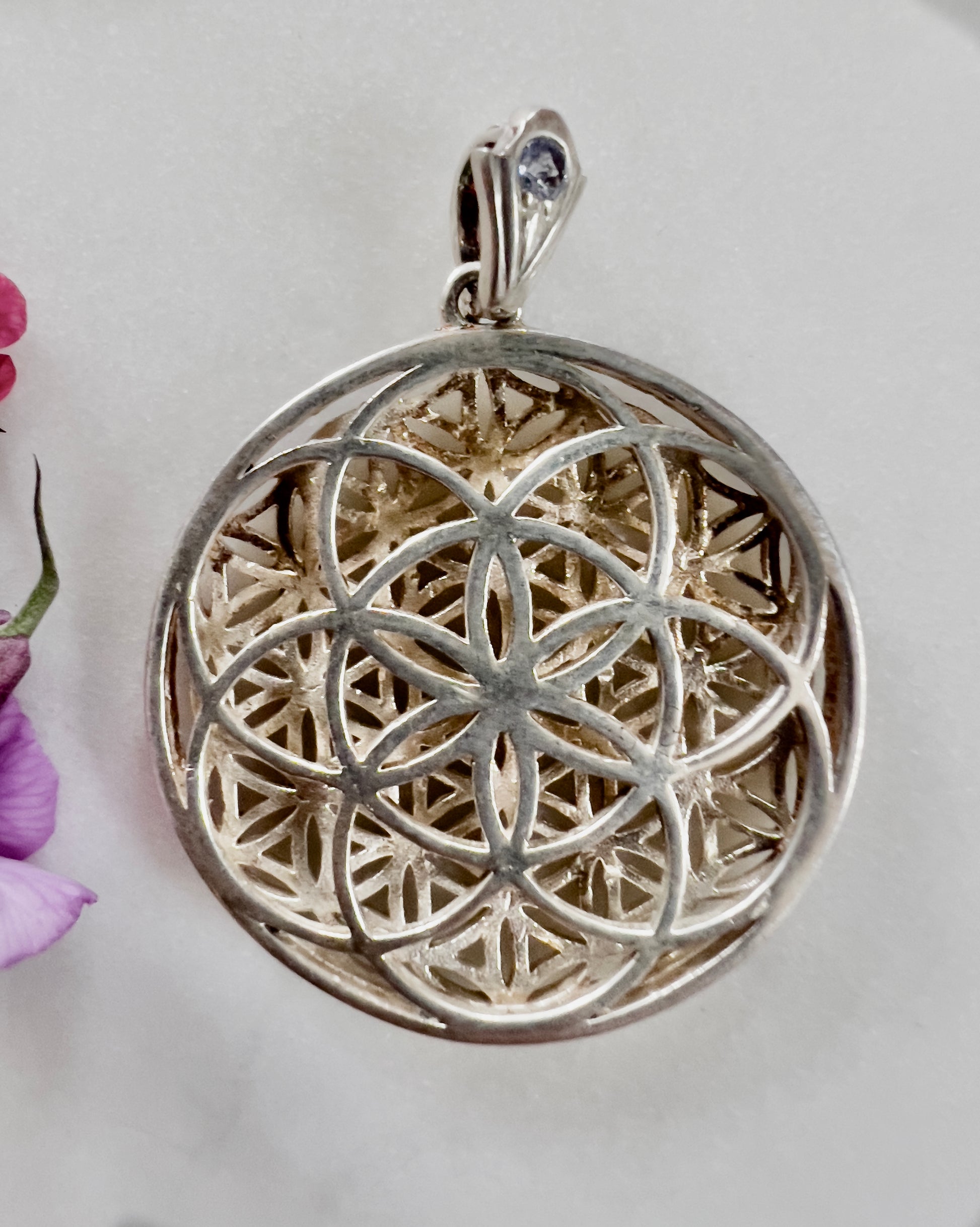 This unique piece of sacred geometry jewelry combines a flower of life and a seed of life design. A beautiful blue sapphire is elegantly placed in the bail.