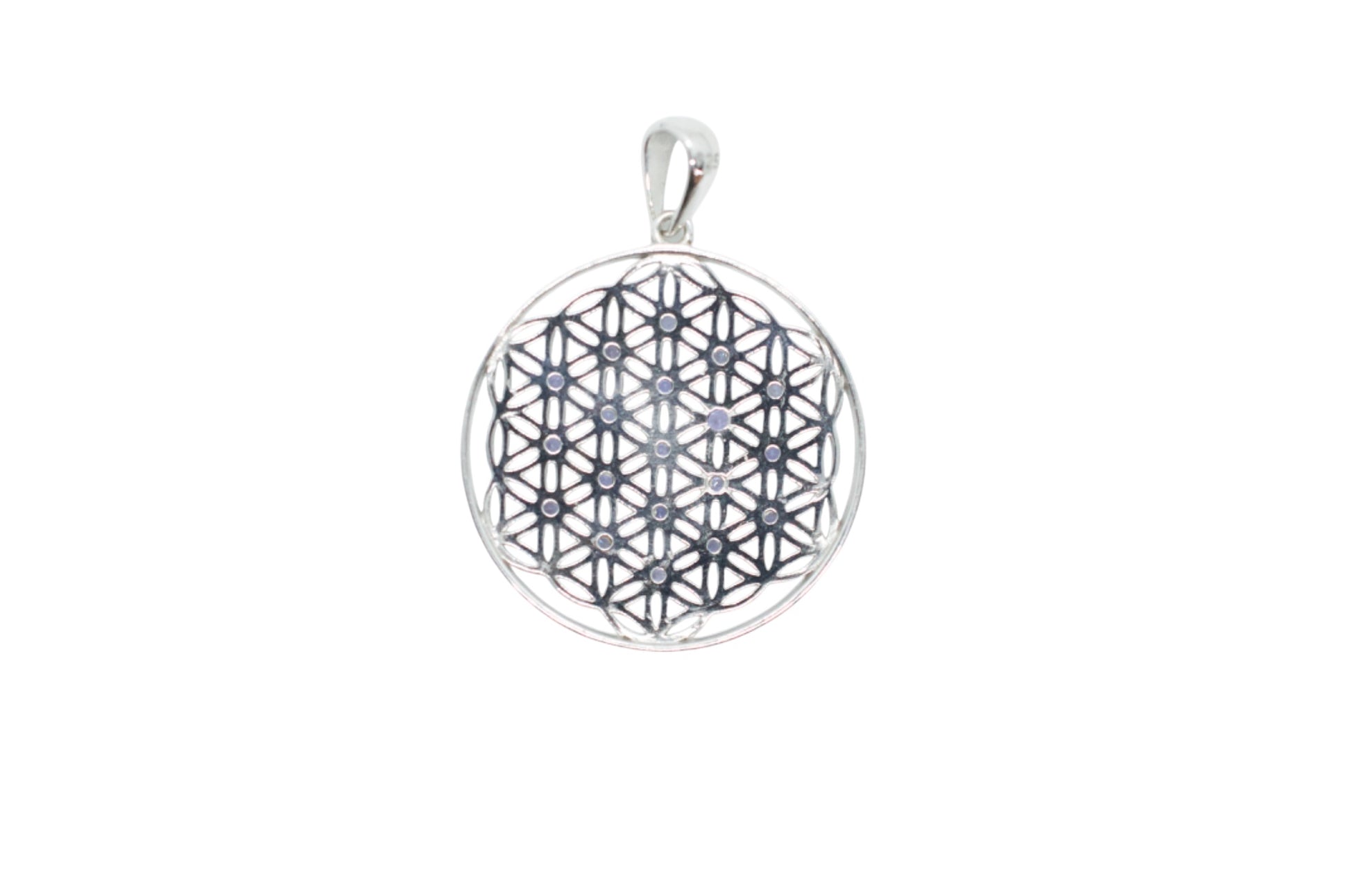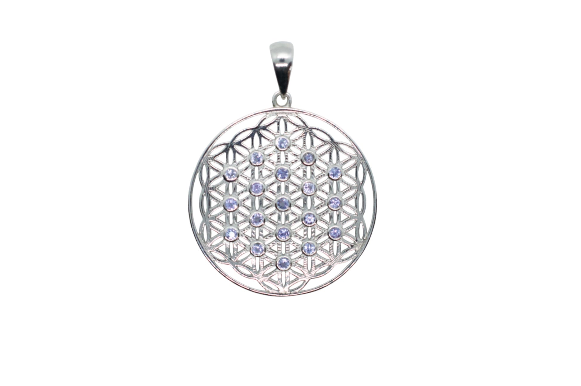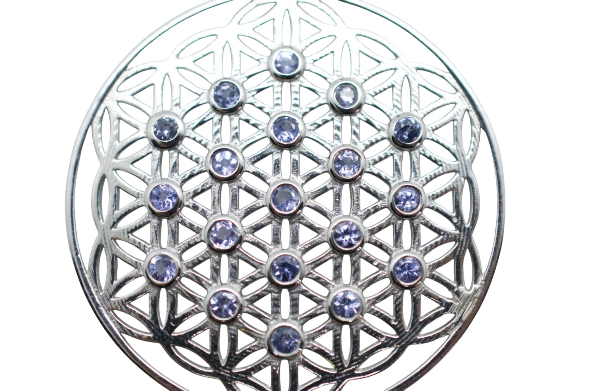 Featuring 2mm blue tanzanite gemstones, this beautiful sacred geometry pendant is made of 925 sterling silver. It's about 1 1/4" in diameter.