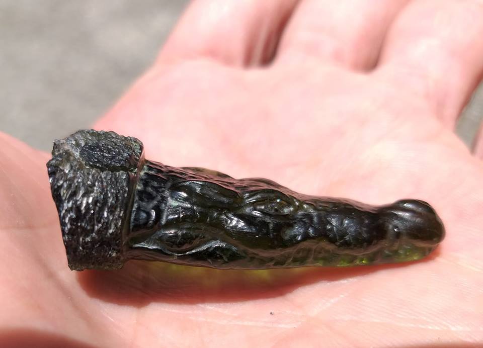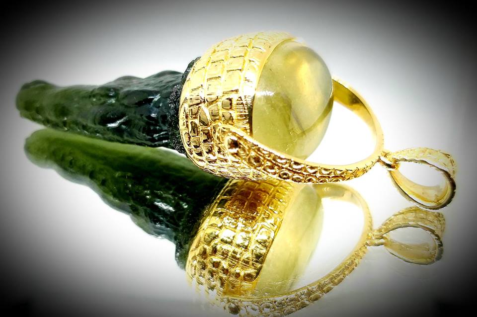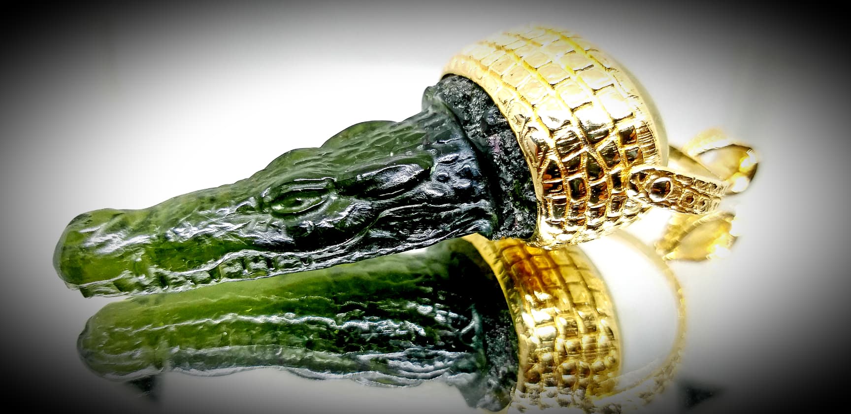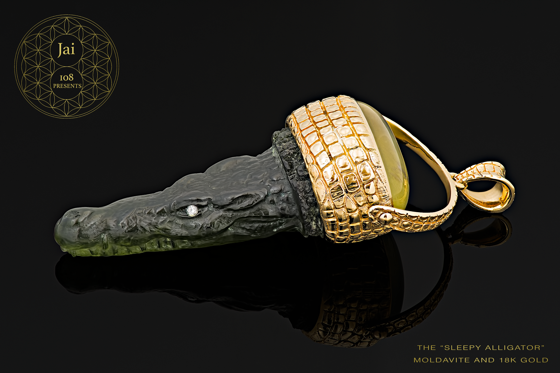 The Alligator weighs in at 16.7 grams but was carved from a piece of moldavite originally weighing over 31 grams!!.. the Lybian Desert Glass cabachon weighs 5.7 grams but was cut from a much larger piece... there is about 18 grams of 18k gold and 2 VS1 diamonds in the eyes... the whole piece is about 3" long (75mm) the gold bar above the cabachons swivels for optimum viewing from above... this piece took six months to make, and involved 6 artisans in 3 countries.... thank you so much... Jai 108 !!!