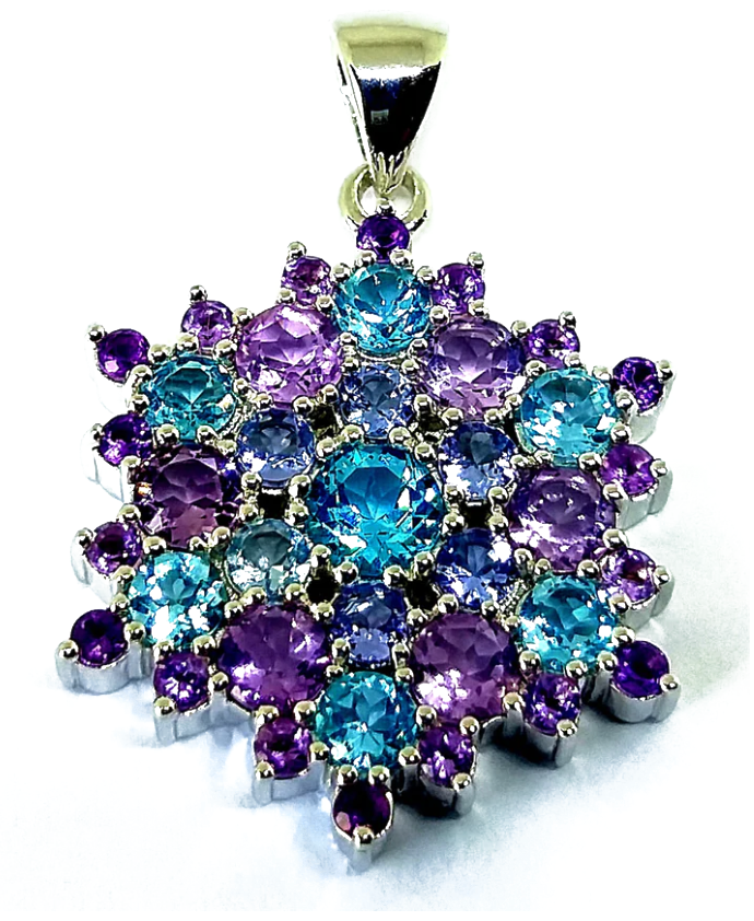 Blue Topaz, Tanzanite, Amethyst and lots of blue sapphire accents in this little piece.. 37 stones altogether in a pendant that measures about 1" across...