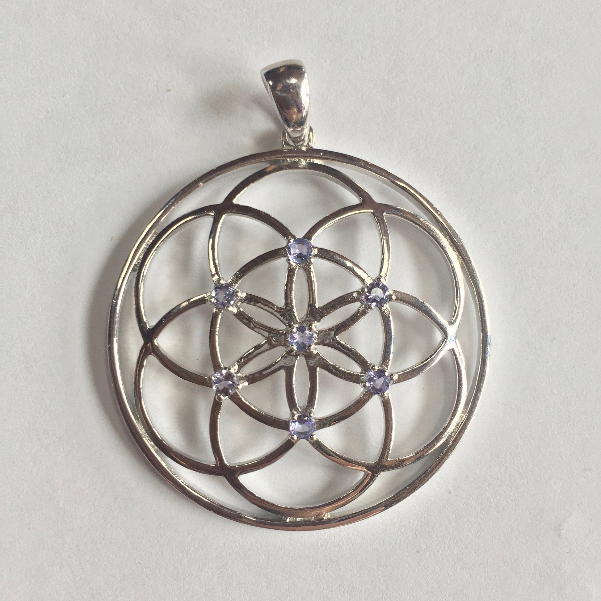 This larger version of our sterling silver seed of life measures about 1.75'' across and is adorned with beautiful pale blue tanzanite. The seed of life is found across the world as an ancient symbol of creation. It is said to bring blessings and protection to those that wear it. It is also used for fertility and to be worn during pregnancy.