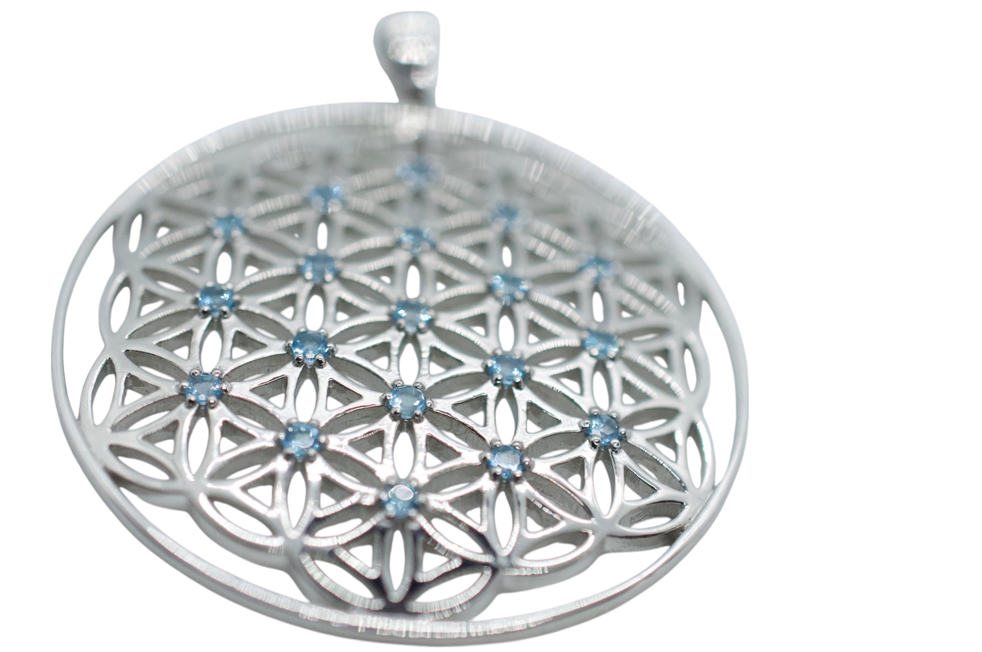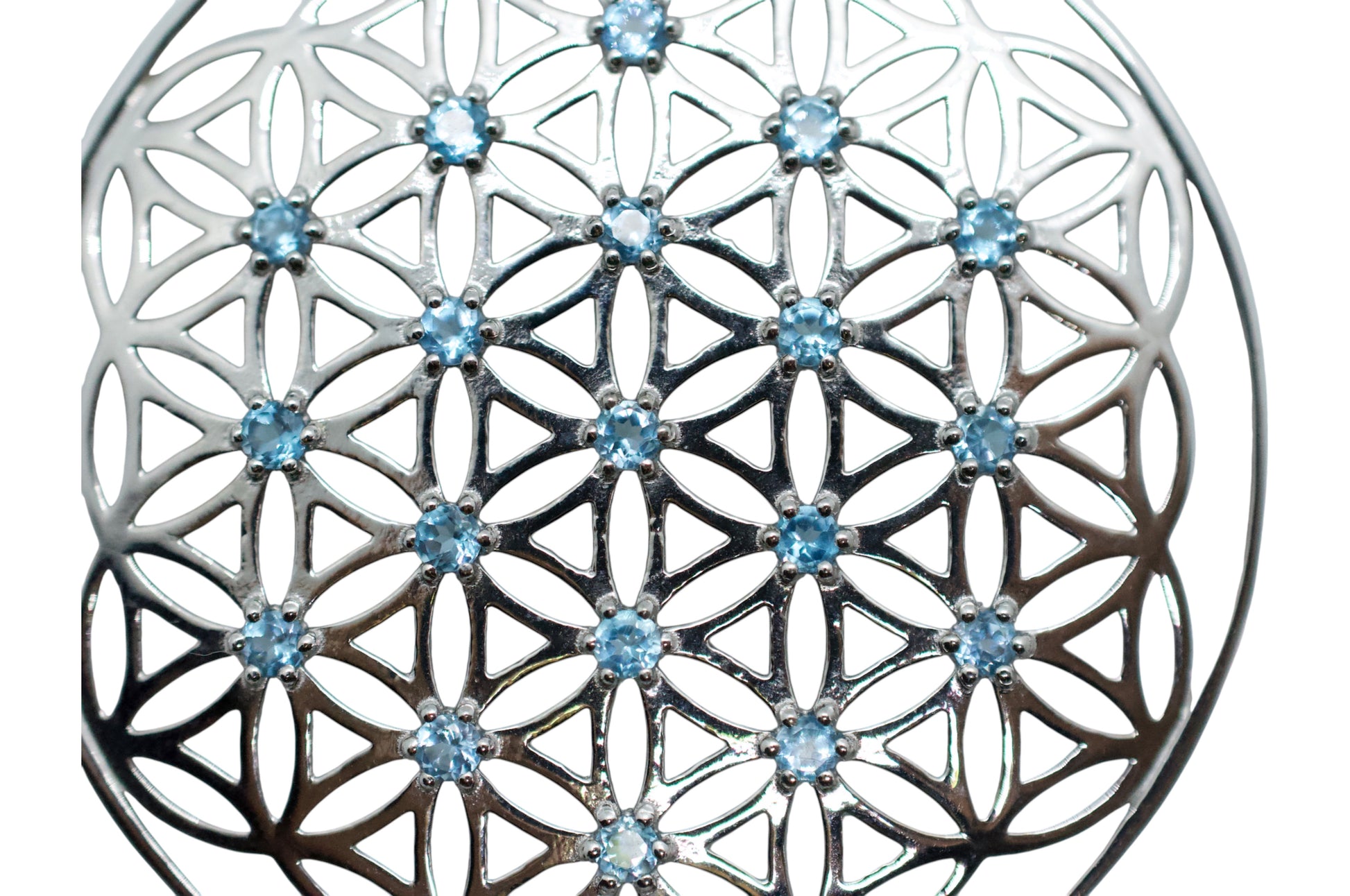 Measuring about 2" across, this sterling silver flower of life glows with beautiful Swiss blue topaz gemstones.