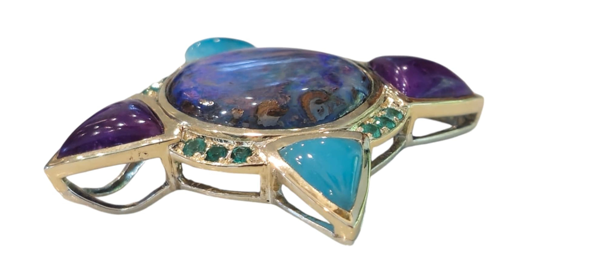 This is a fun pendant we call "The Cosmic Compass." There is a large Boulder opal in the center (14.3 carats). The compass points consist of two pieces of gel sugilite and two pieces of hemimorphite. Twelve beautifully cut emeralds are between them. The top of this pendant is made with over five grams of 9k gold and set in a base of sterling silver.