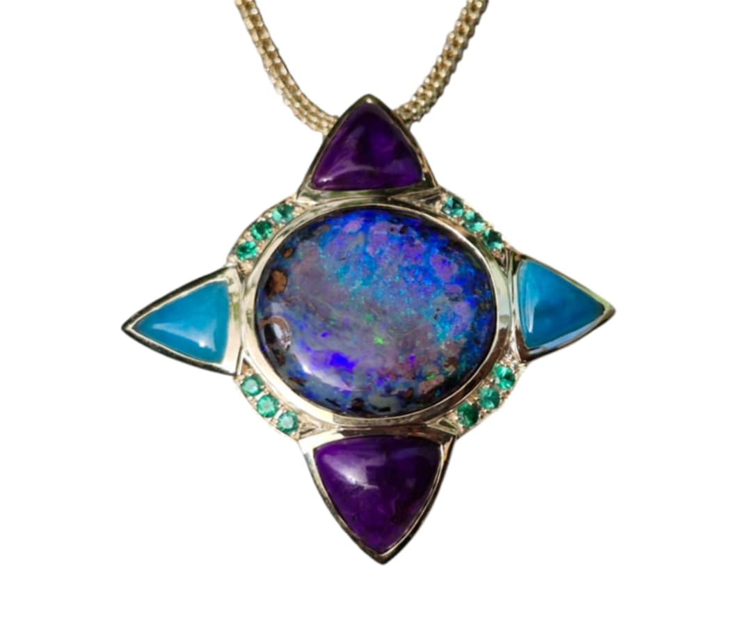 The Cosmic Compass 9K Gold Pendant Featuring Boulder Opal, Hemimorphite, Emerald, & Sugilite