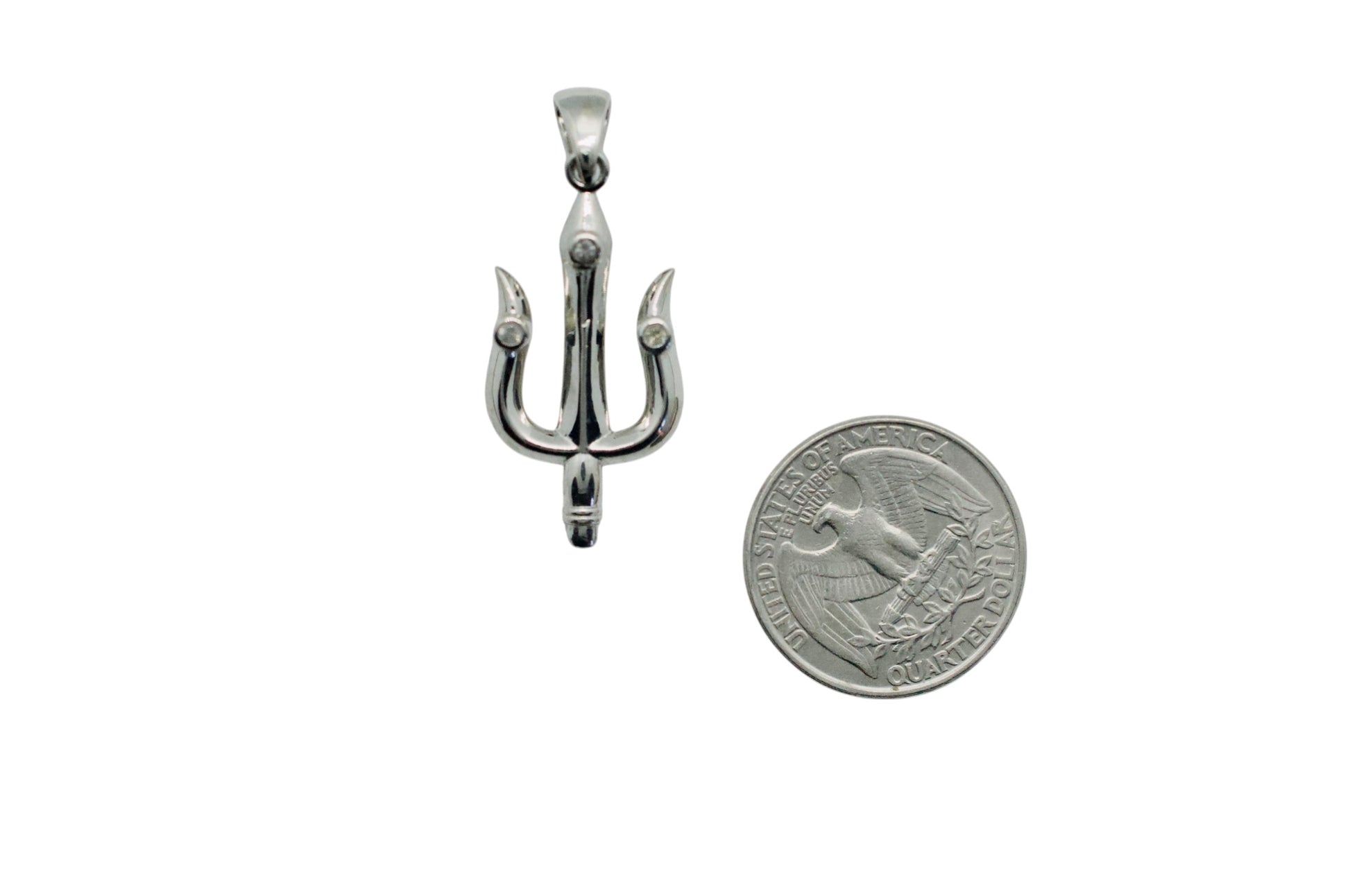Without the bail, this sterling silver trishul measures about 1.25" in length and a little over 0.5" across. With the bail, it is a little over 1.5" in length.